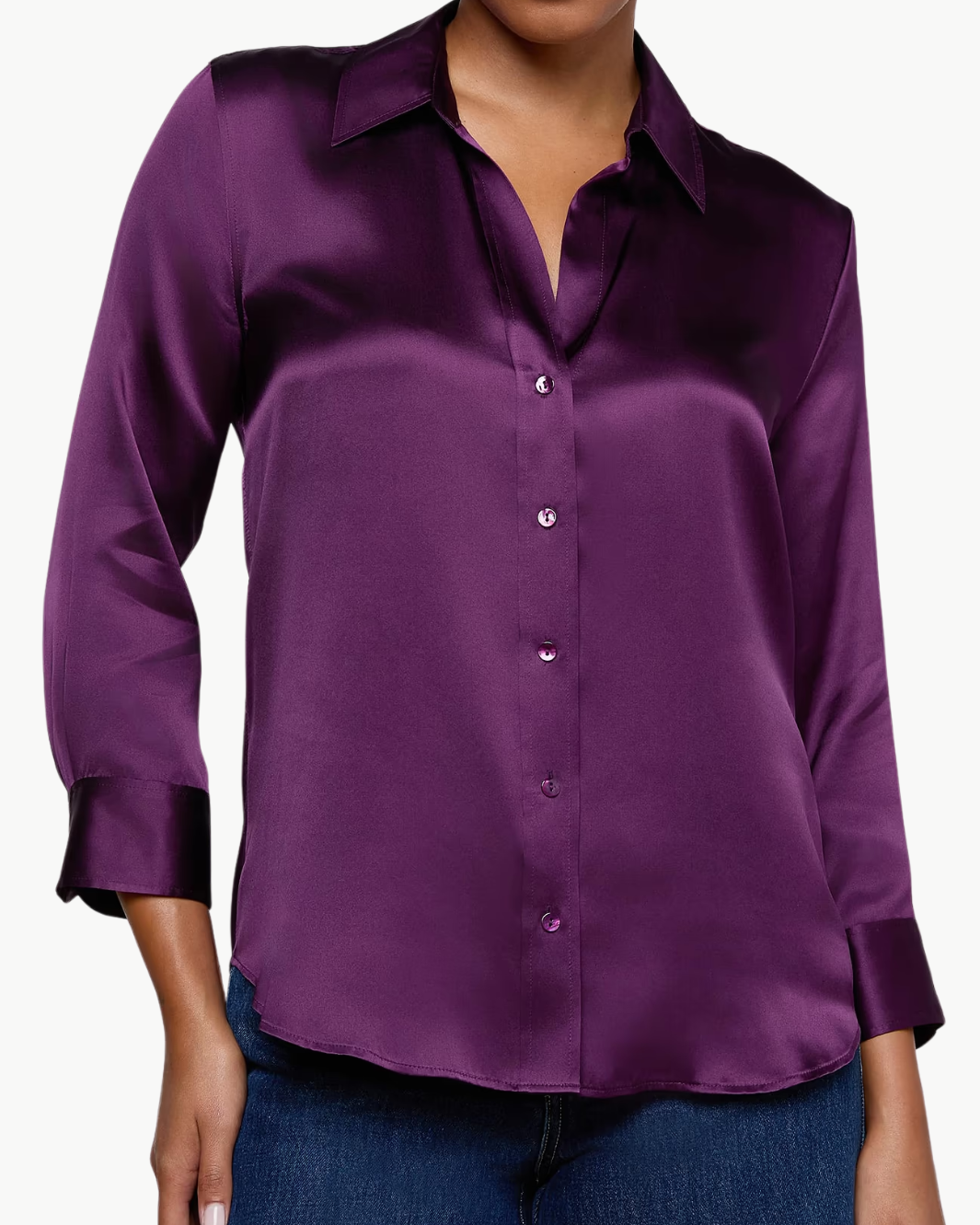 Meet the Dani Silk Blouse—an iconic button-down designed to anchor a polished wardrobe. Cut from fluid silk charmeuse, this signature style features three-quarter sleeves and a high-low shirttail hem that adds movement and ease. A slim fit and classic front button closure keep the look refined, whether worn tucked, loose, or layered.
