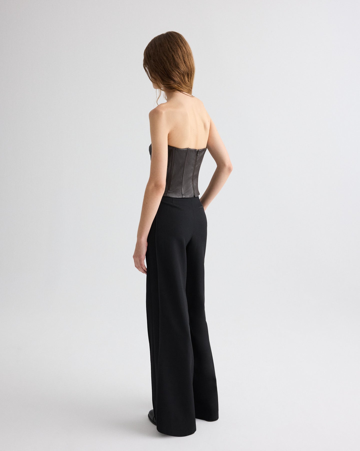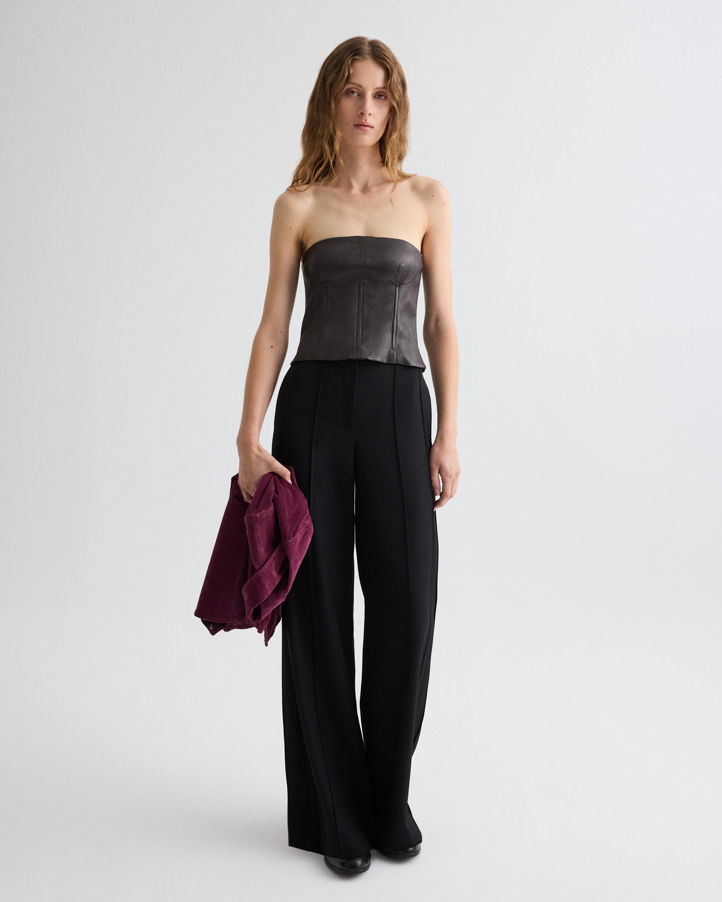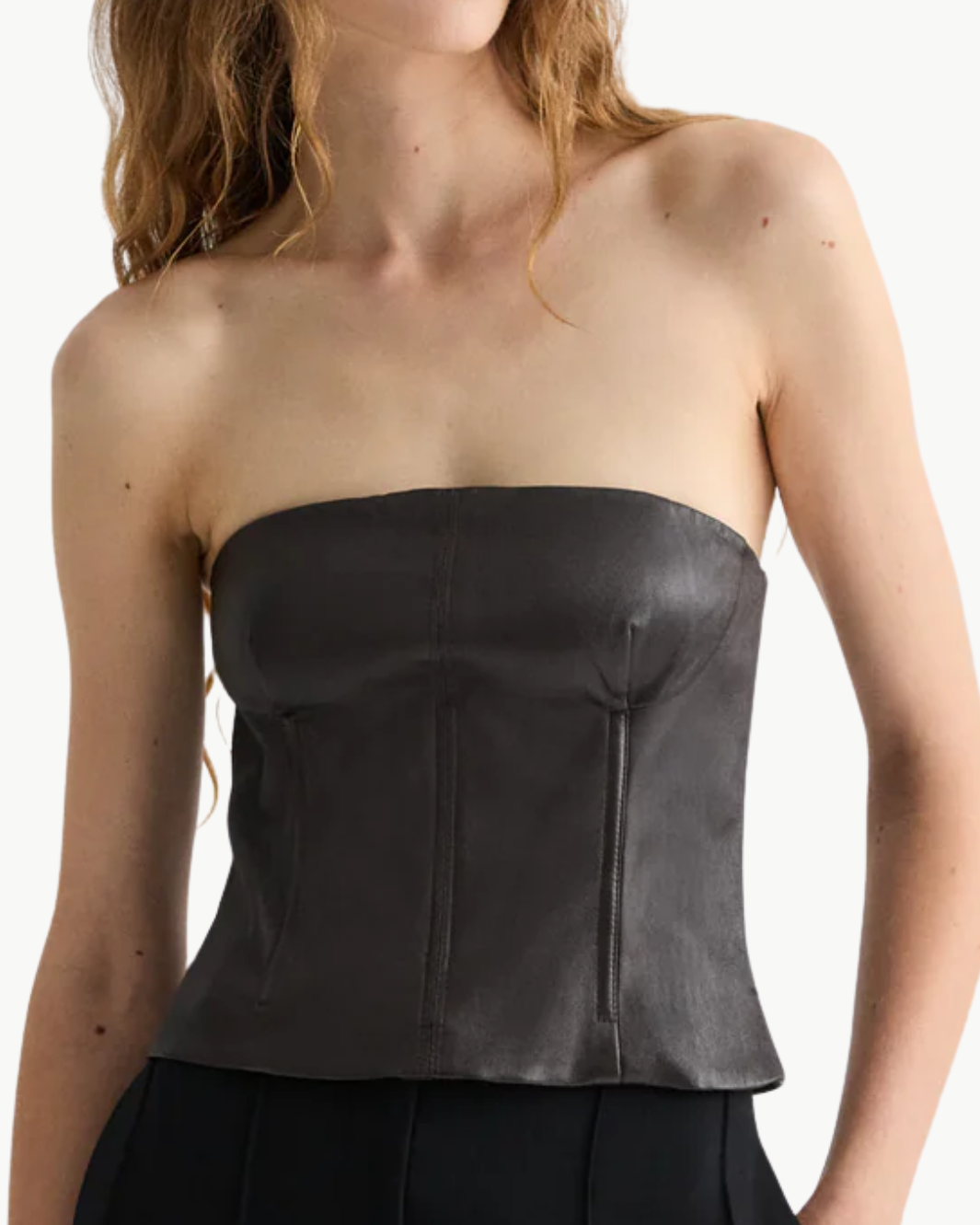 The Jillian Bustier delivers a sleek, sculptural take on leather dressing. Designed to contour the body, this strapless silhouette is crafted in supple stretch lamb leather with a smooth, double-faced finish that elevates its minimalist edge. Precision tailoring highlights the natural shape, making it a striking standalone piece or a refined layering essential.