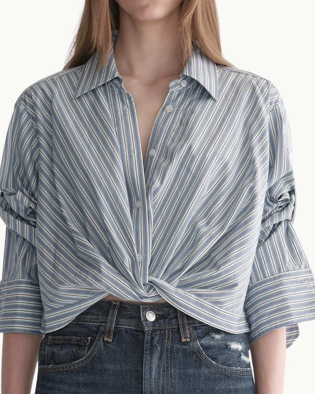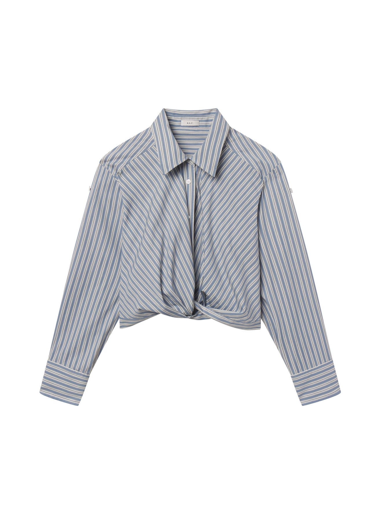 The Leo Top is crafted from crisp cotton shirting and designed in a cropped button-down silhouette with a modern, sculpted twist. A sharp collar and convertible long sleeves balance the relaxed fit, while a twisted front hem adds dimension and hits at the navel for an effortless, contemporary shape.