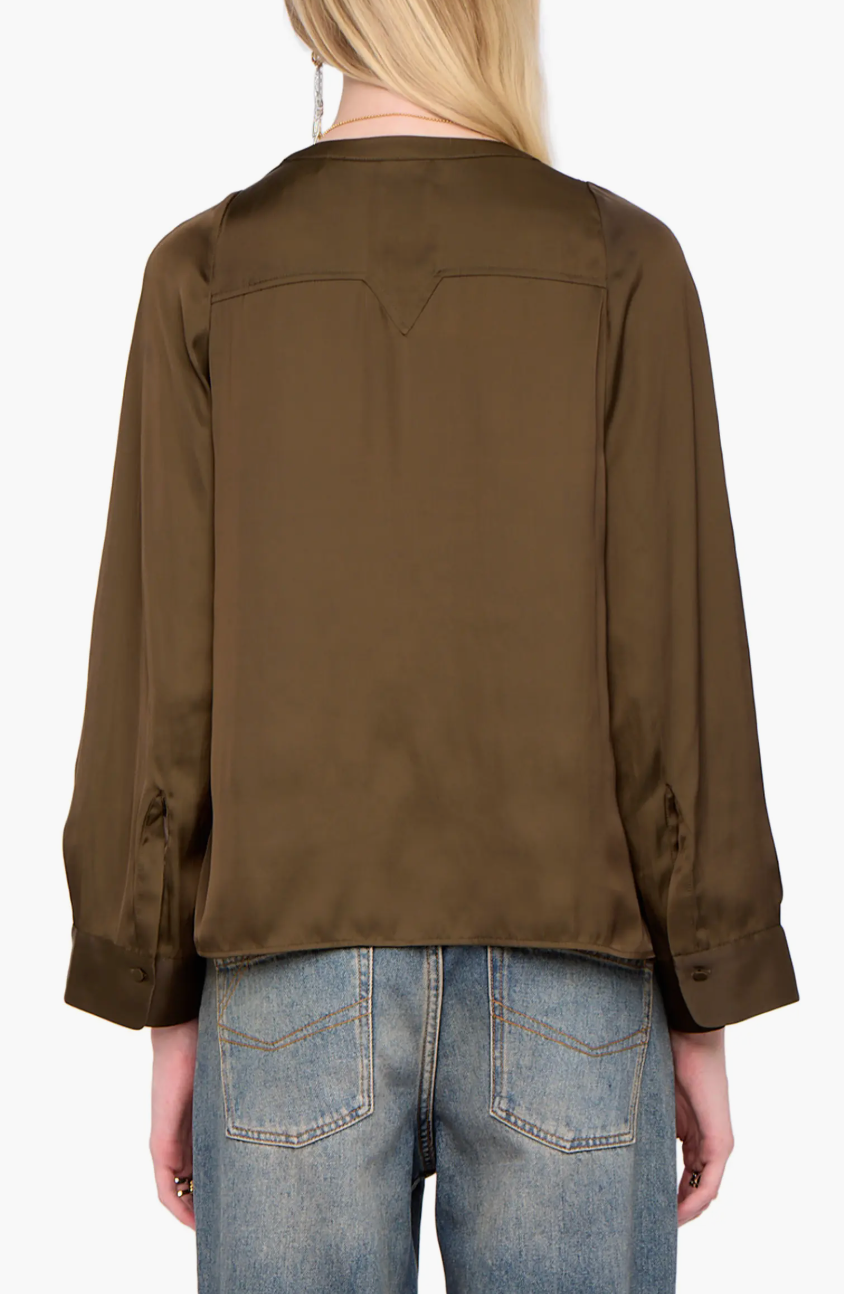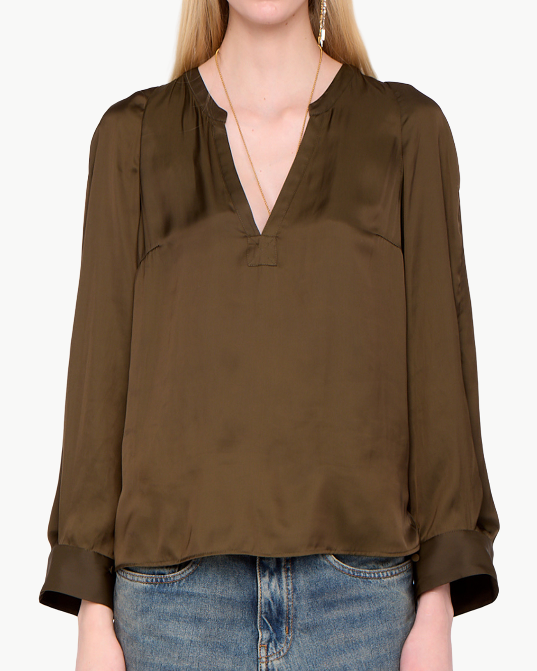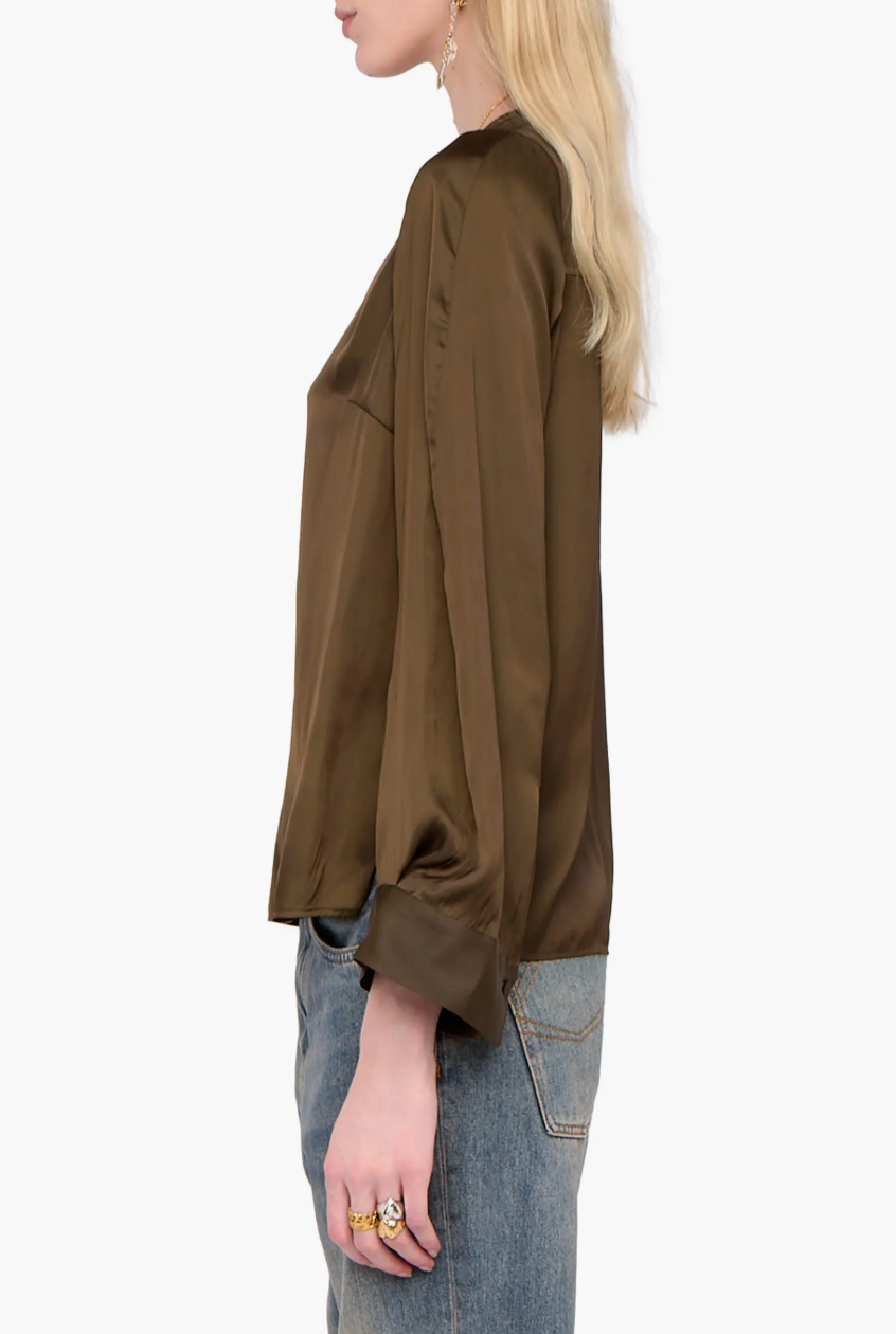 The Torny Satin Split Neck Top is defined by a fluid silhouette and soft sheen that elevate an easy popover shape. Designed with a band collar and split neckline, it drapes effortlessly through the body while long sleeves with buttoned cuffs add refined structure. An understated yet polished piece that works seamlessly from day to evening.