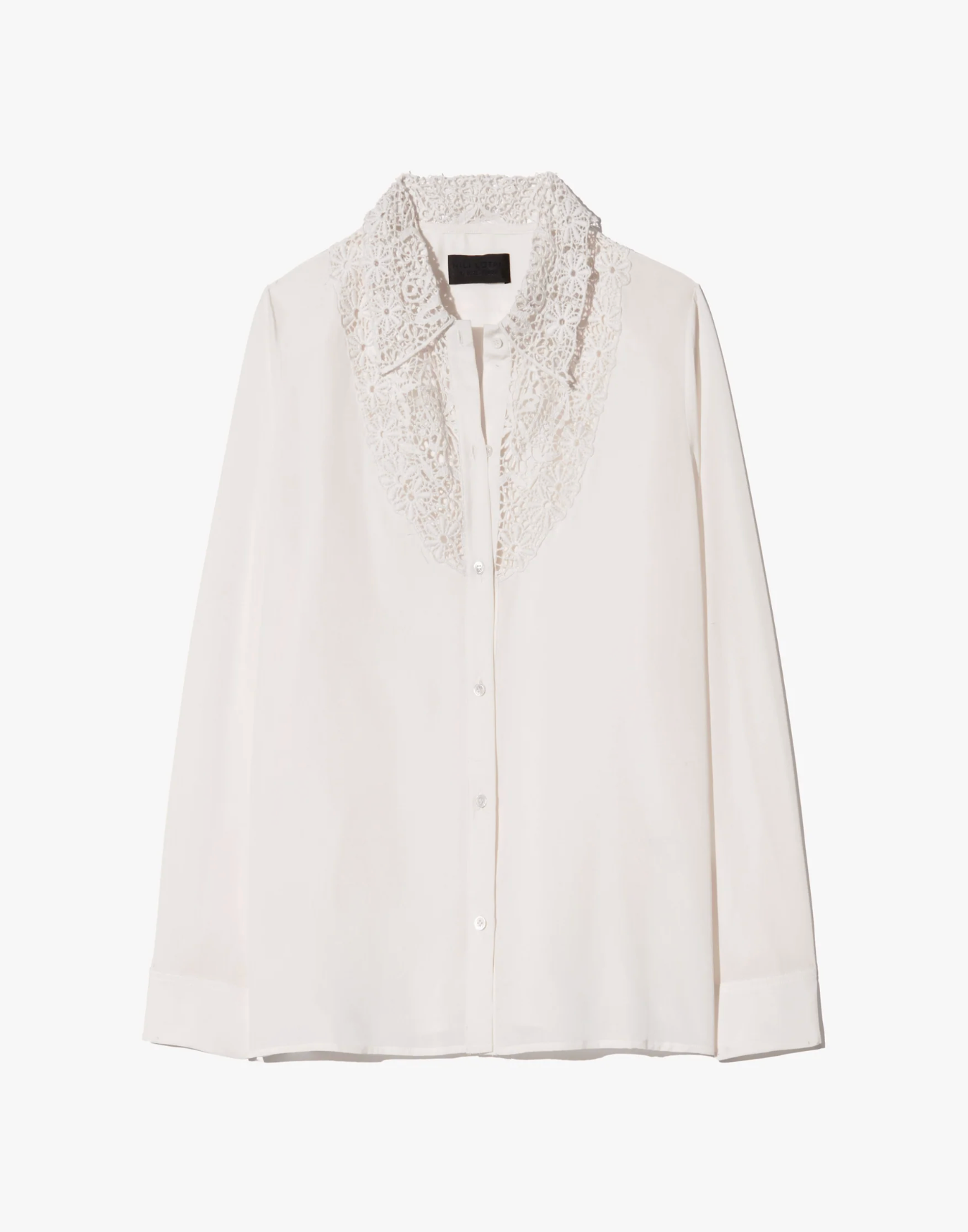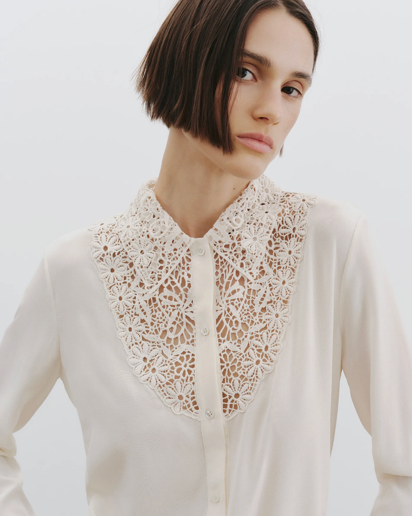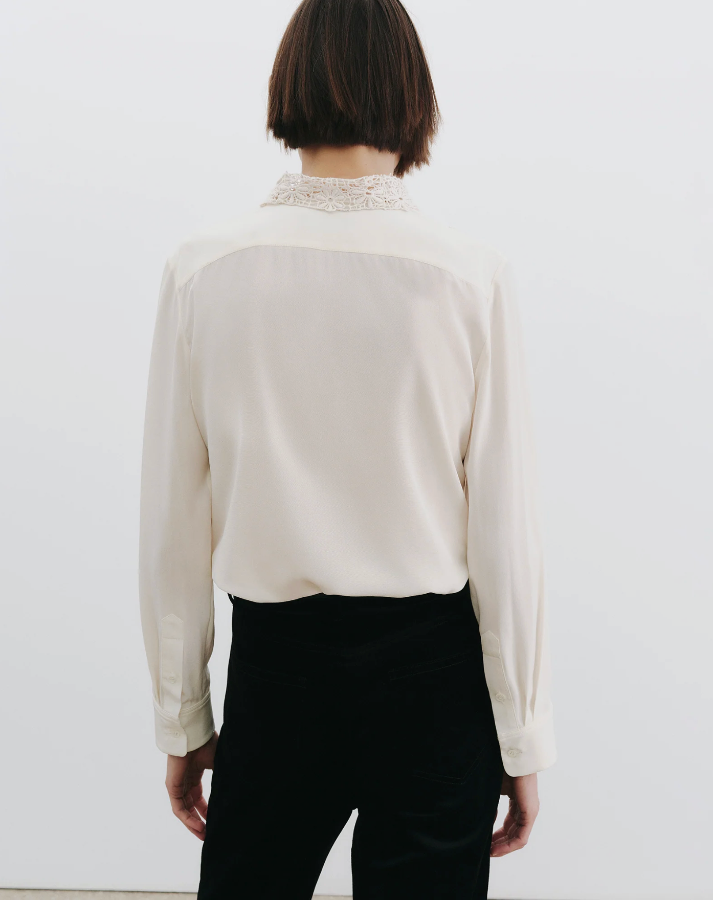 The Zola Lace Silk Shirt is a refined take on classic tailoring, elevated with delicate artisanal detail. Cut in a slim silhouette, this silk blouse features a custom cotton lace insert and collar crafted in India, adding subtle texture and femininity to its clean lines. Finished with pleated cuffs and a straight hem, it’s a polished piece that transitions effortlessly from day to evening.