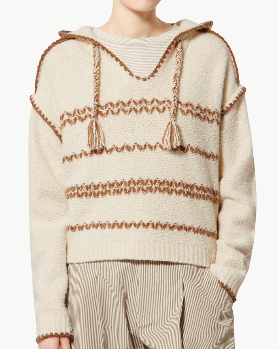 The Romera Sweater blends cozy craftsmanship with an effortless, lived-in feel. Designed in a tweed-style merino wool knit, this hooded silhouette is elevated with subtle contrasting ribbon details that add texture and visual interest. A relaxed fit with dropped armholes gives it an easy drape, while the V-neckline and drawstring hood finished with playful pompoms keep the look casual yet considered. It’s the kind of sweater that feels just as right layered over denim as it does styled for a polished off-duty moment.