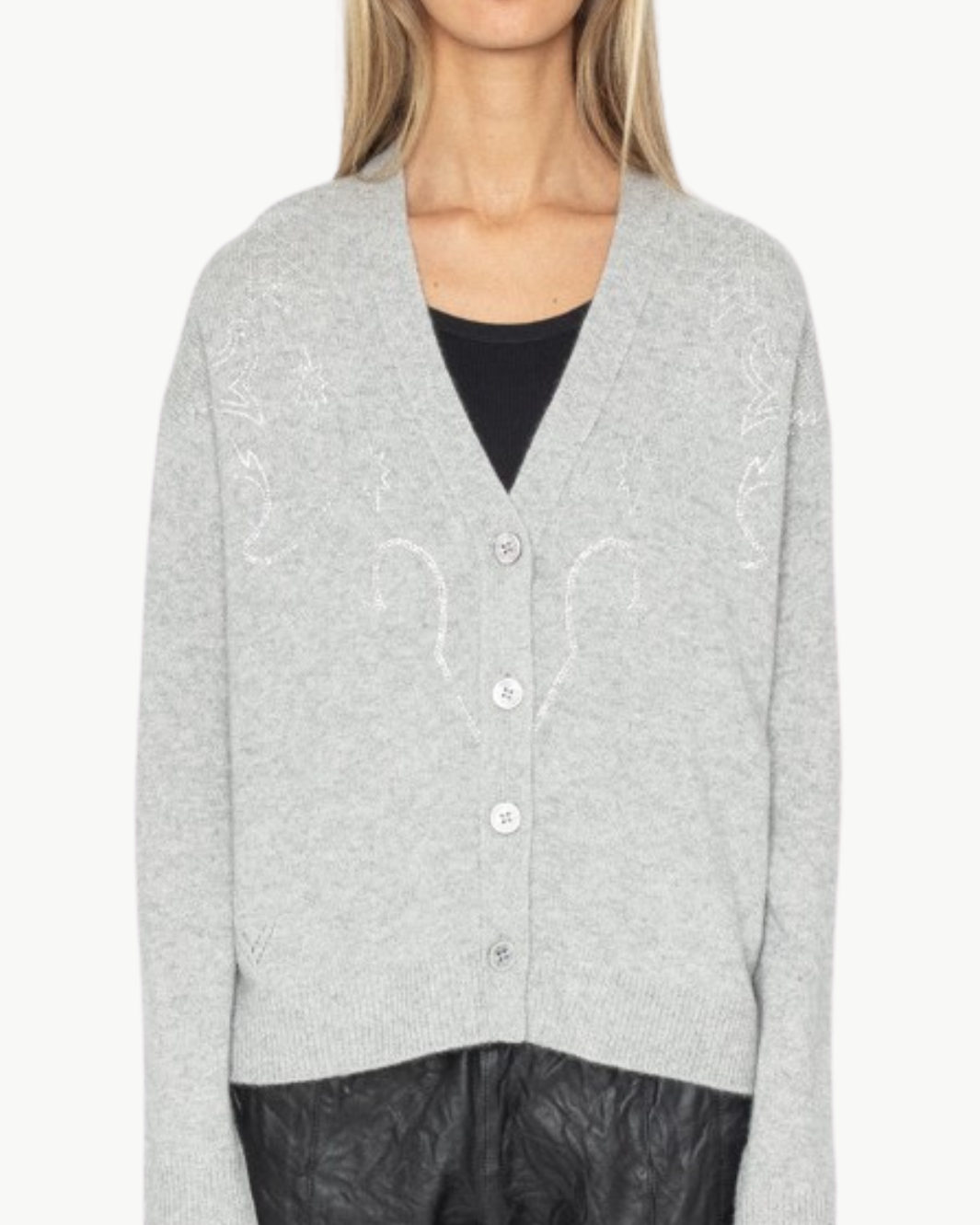 The Mirkaz Cashmere Cardigan is a refined yet statement-making layer crafted from pure cashmere and detailed with western-inspired rhinestone embellishments across the front and back. A classic V-neck and buttoned front keep the silhouette timeless, while the subtle sparkle adds an elevated edge. Designed for effortless layering, it blends softness, structure, and standout design.
