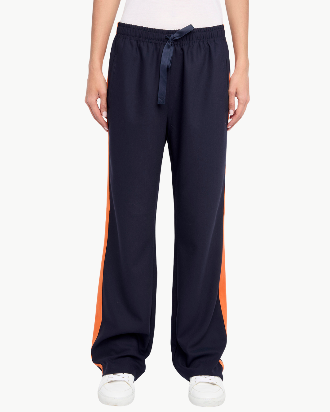 The Poma Pants blend tailored structure with an effortless jogging-inspired feel. Designed with straight legs and refined satin band detailing, they feature piped pockets and a low-rise elastic waistband that balances polish with comfort. An easy pull-on silhouette that works seamlessly for everyday wear with a modern edge.