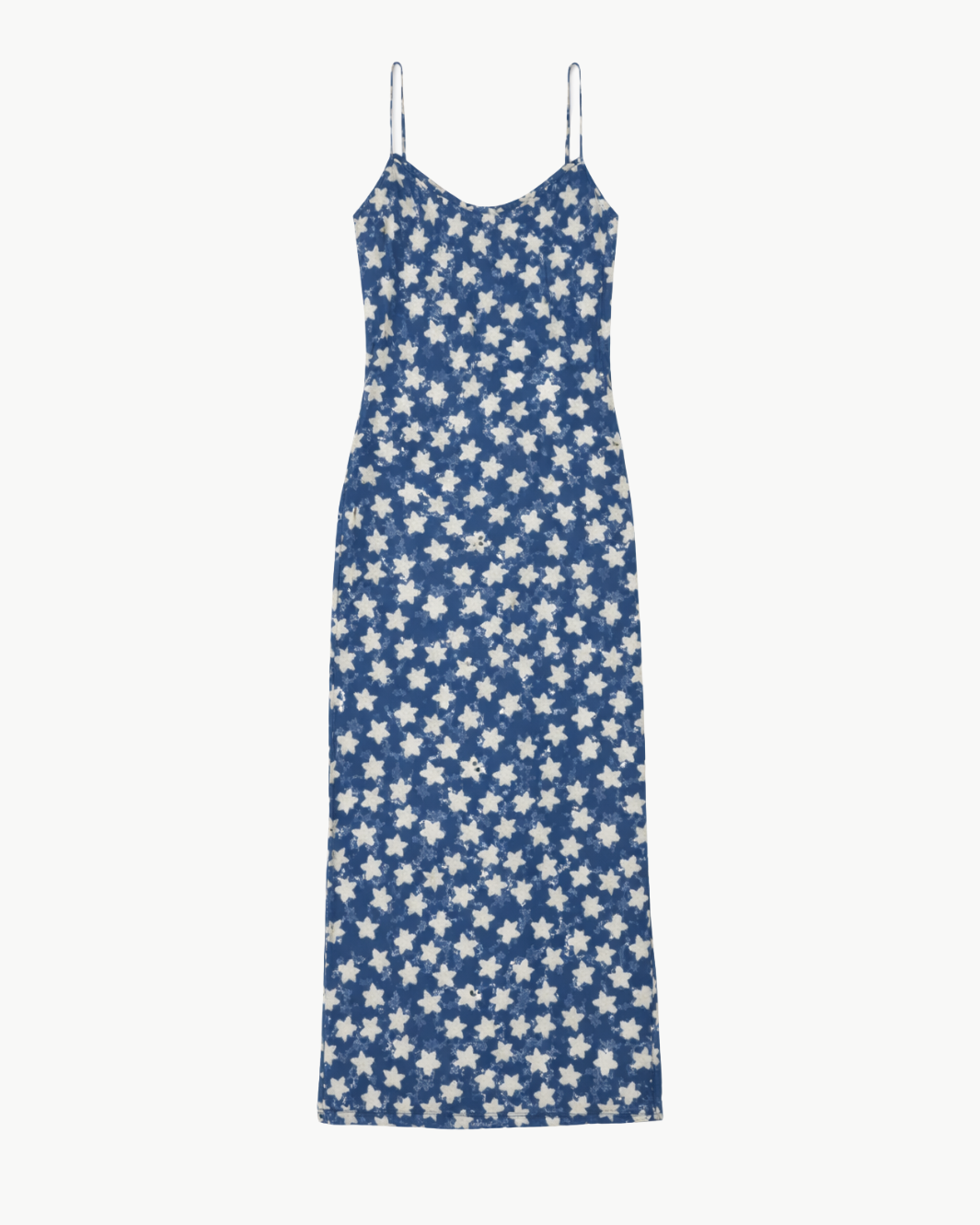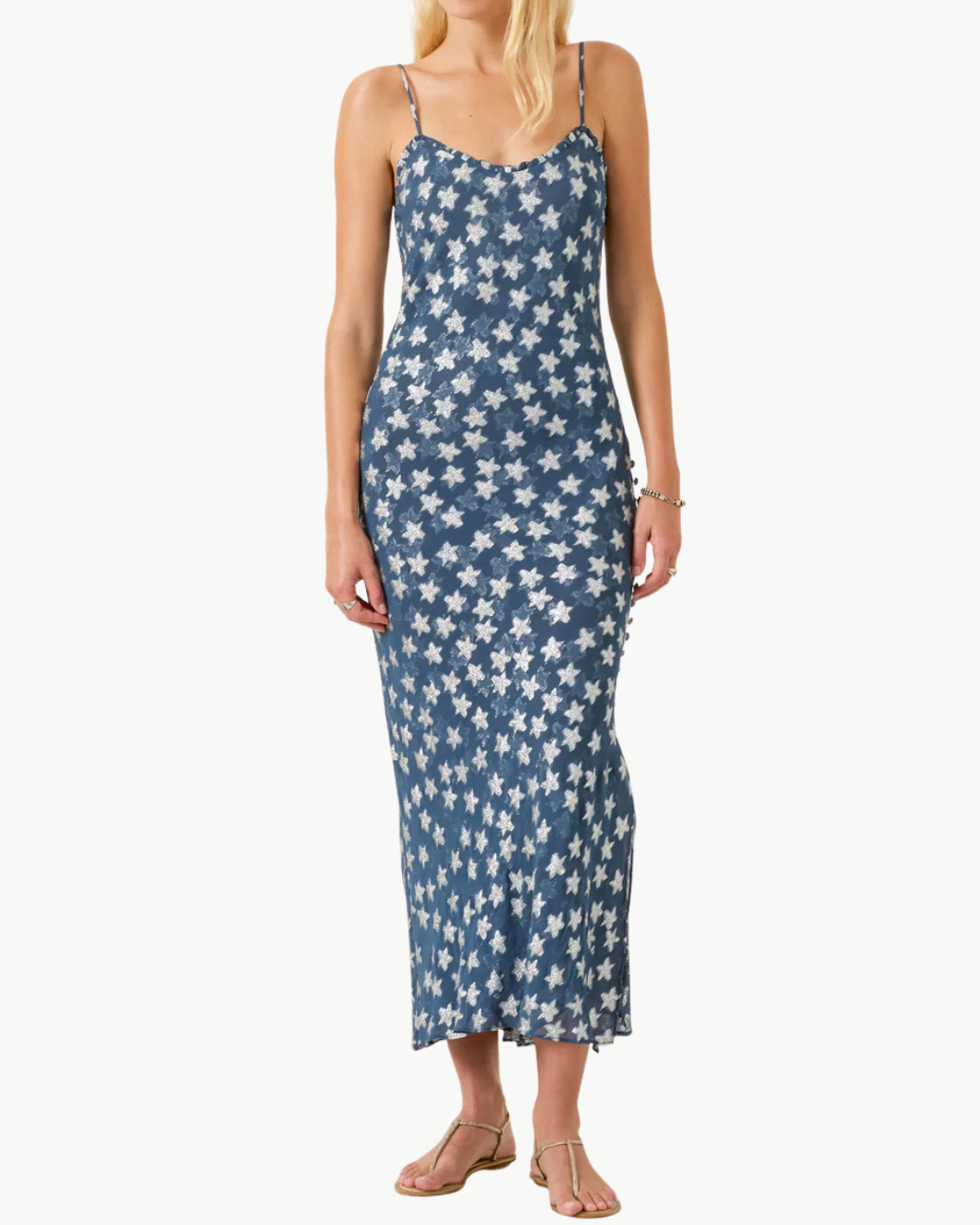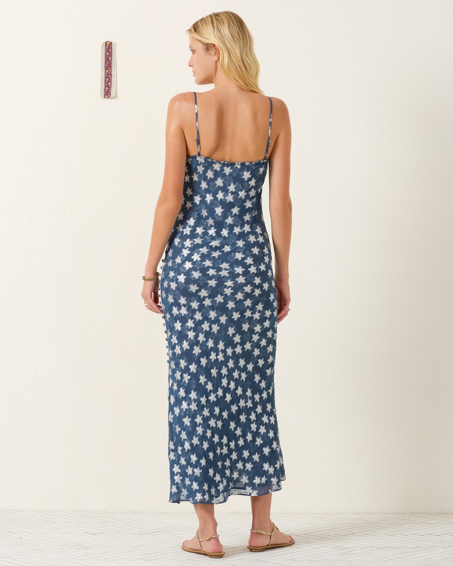 The Athens Starlite Dress captures effortless elegance with its fluid slip silhouette and subtle shimmer. Cut on the bias for a flattering drape, this maxi dress features a delicate ruffle-trimmed sweetheart neckline and metallic fil-coupé stars that softly catch the light. The fully lined design and adjustable straps ensure both comfort and an easy, feminine fit—perfect for warm evenings or special occasions.