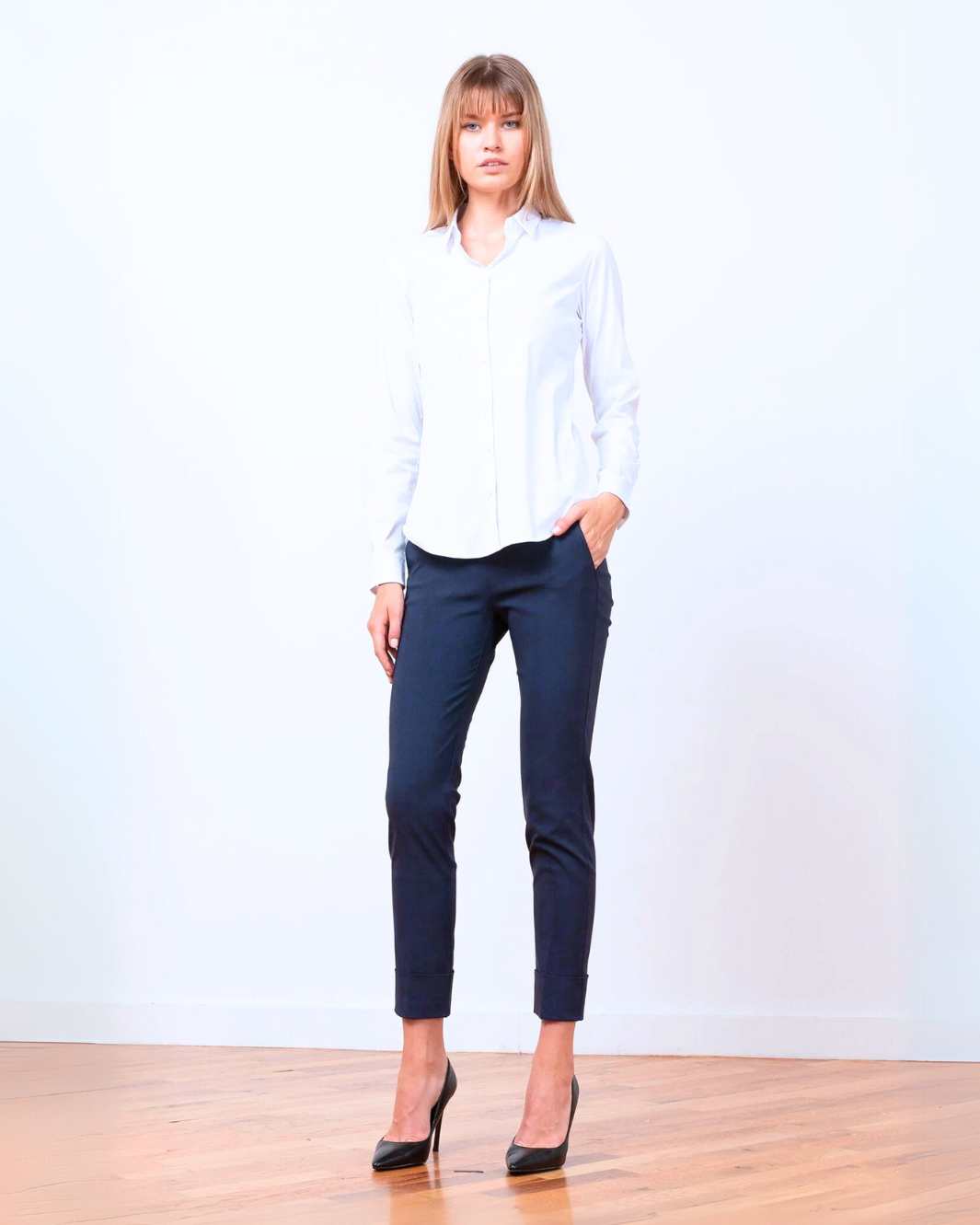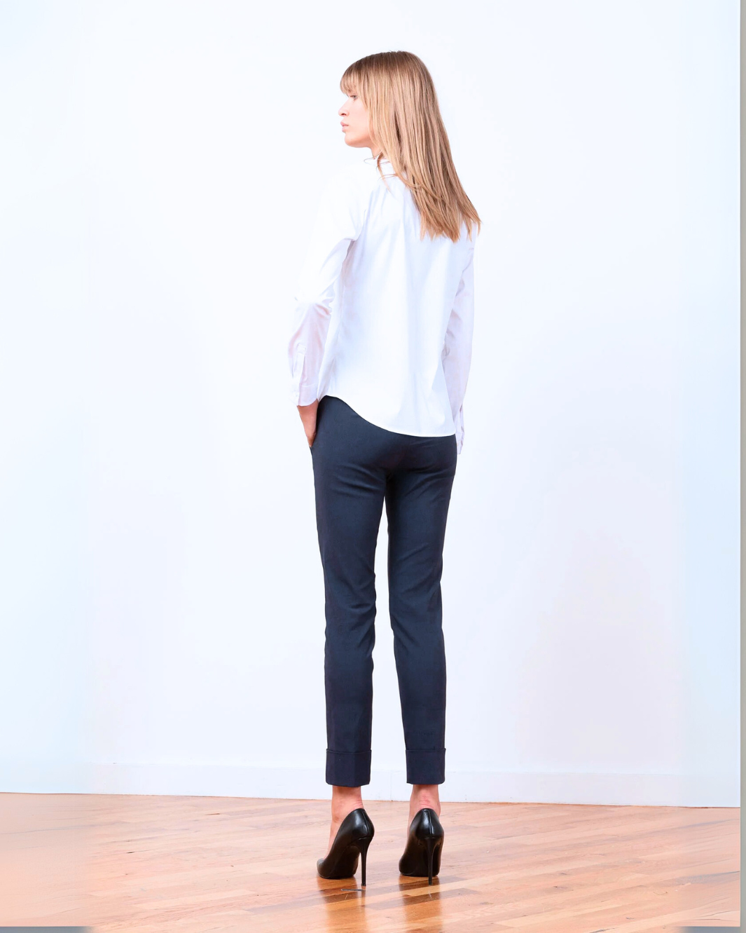 The BEN style is a straight leg, ankle-length, pull-on pant with side pockets and a cuff. Perfect to be worn conservatively for work or playfully for dinner. The Avenue Montaigne Signature stretch fabric will offer you incomparable comfort during all seasons. Very soft to the touch, it has a natural fluidity that will sublimate all silhouettes.