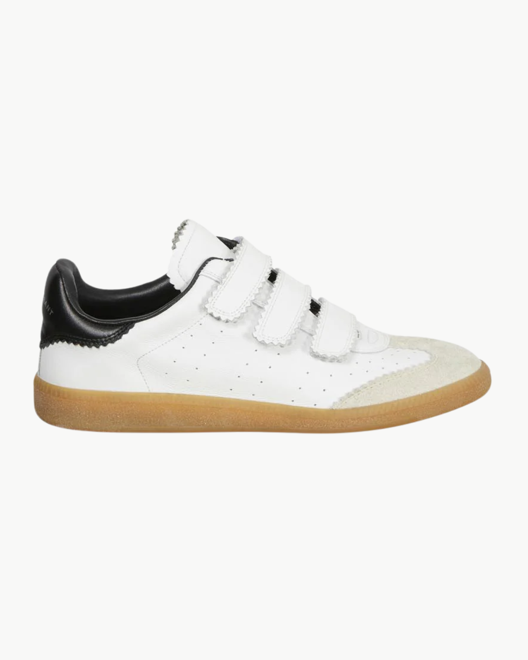 The Beth Sneaker is a modern low-top designed with a balance of sporty ease and refined detail. Crafted from smooth leather with suede accents at the toe, this silhouette features perforated side panels and serrated finishes for subtle texture. Velcro strap closures and a padded tongue enhance comfort, while logo detailing at the back adds a signature finish. An easy everyday sneaker with a polished edge.