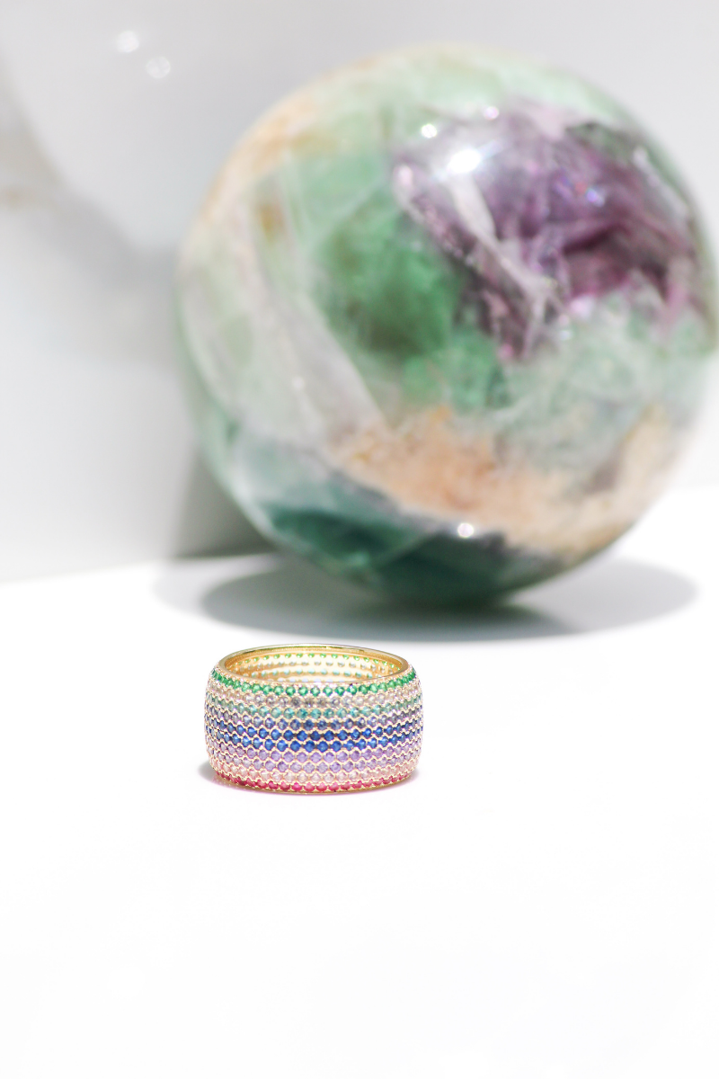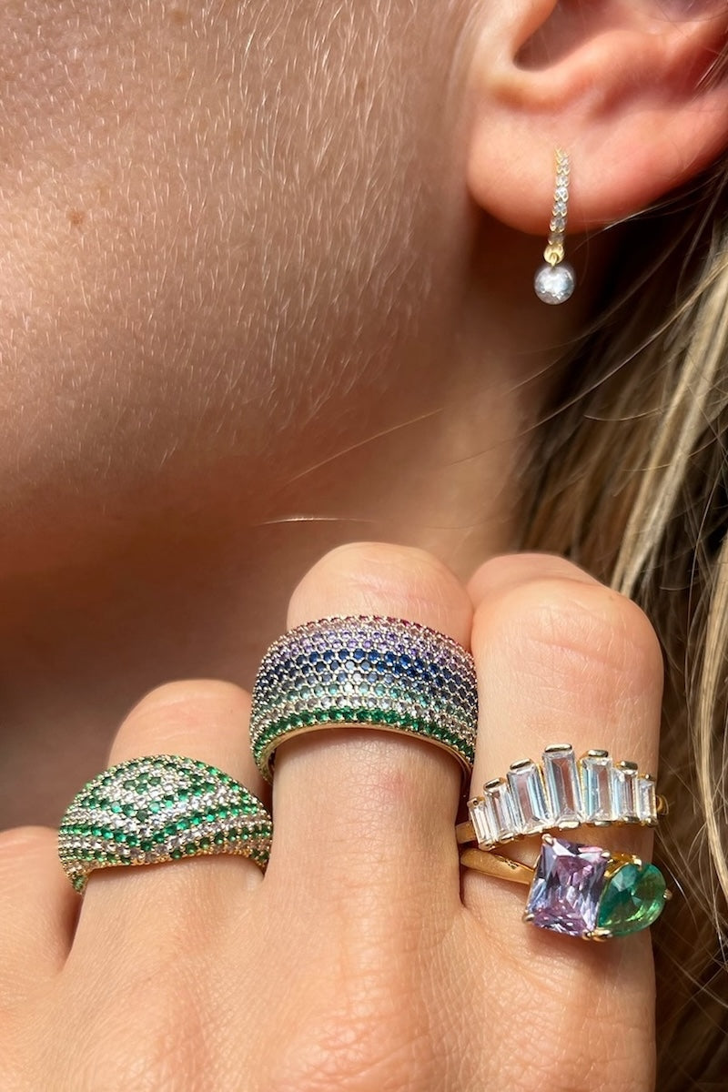 Refined yet expressive, the Billionaire Ring in Blossom brings a fresh, feminine perspective to a bold cigar-style silhouette. Crafted in luminous 14K gold vermeil, this statement ring is adorned with multi-colored cubic zirconia in soft blue, green, and pink tones, creating a delicate interplay of color and light. The result is a striking balance of strength and elegance—eye-catching without feeling overdone. Designed to be worn and cherished, this piece reflects Native Gem’s dedication to elevated, everyday luxury, thoughtfully made with hypoallergenic, lead-free, and cadmium-free metals that bridge the gap between fine jewelry and modern accessibility.