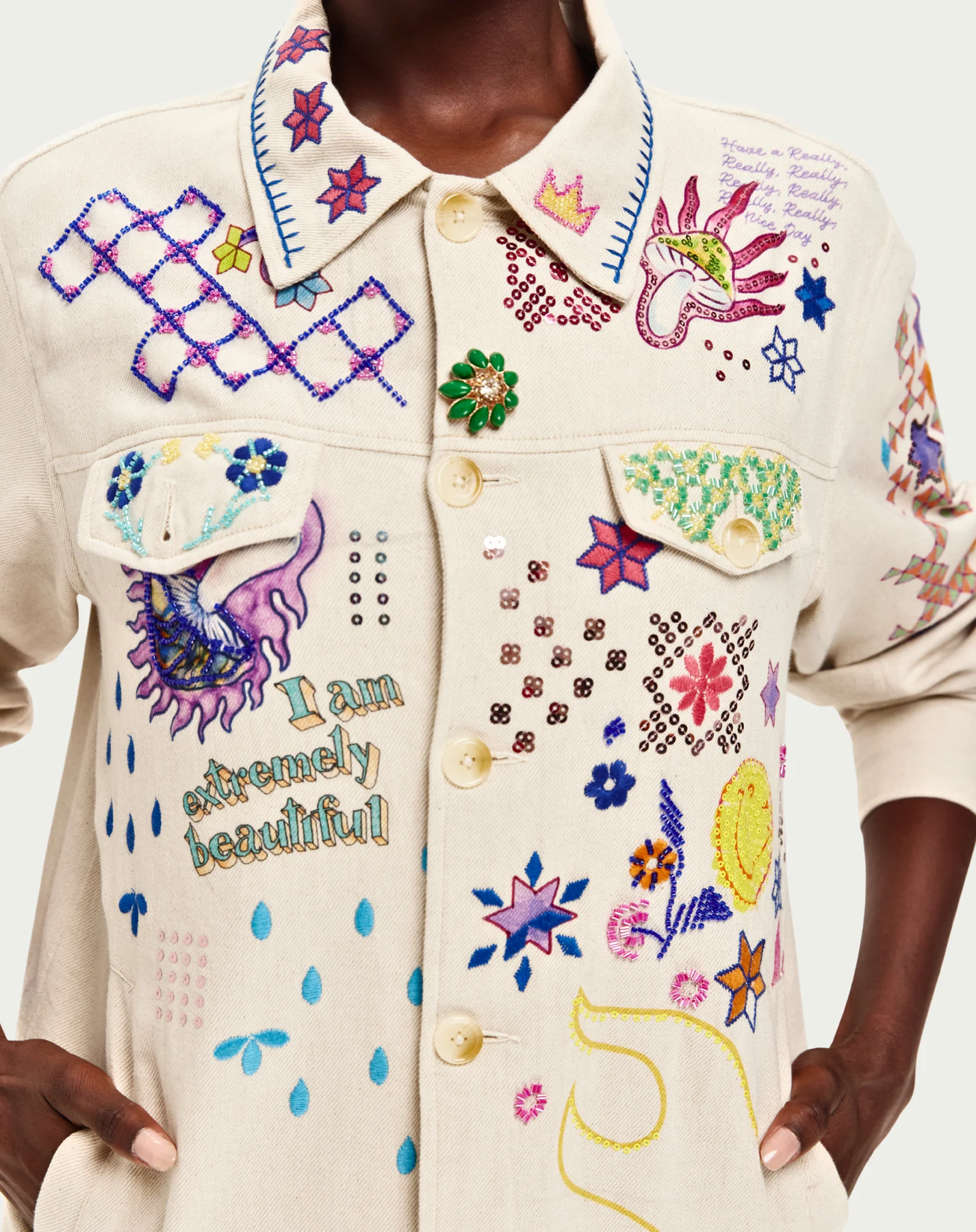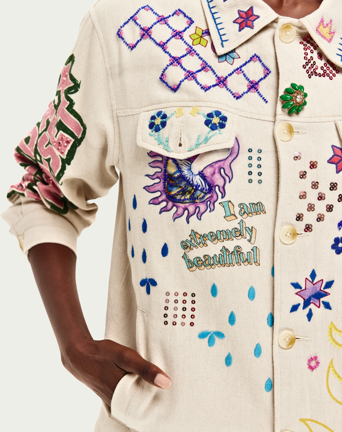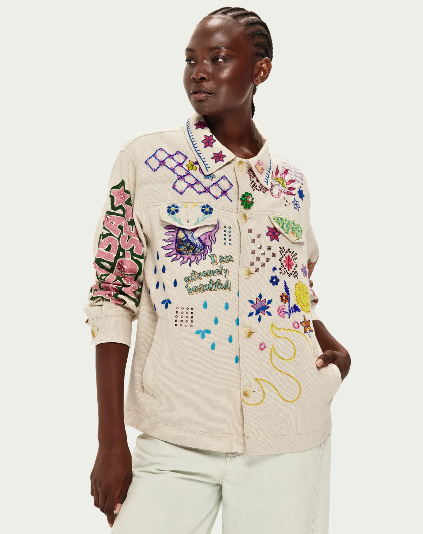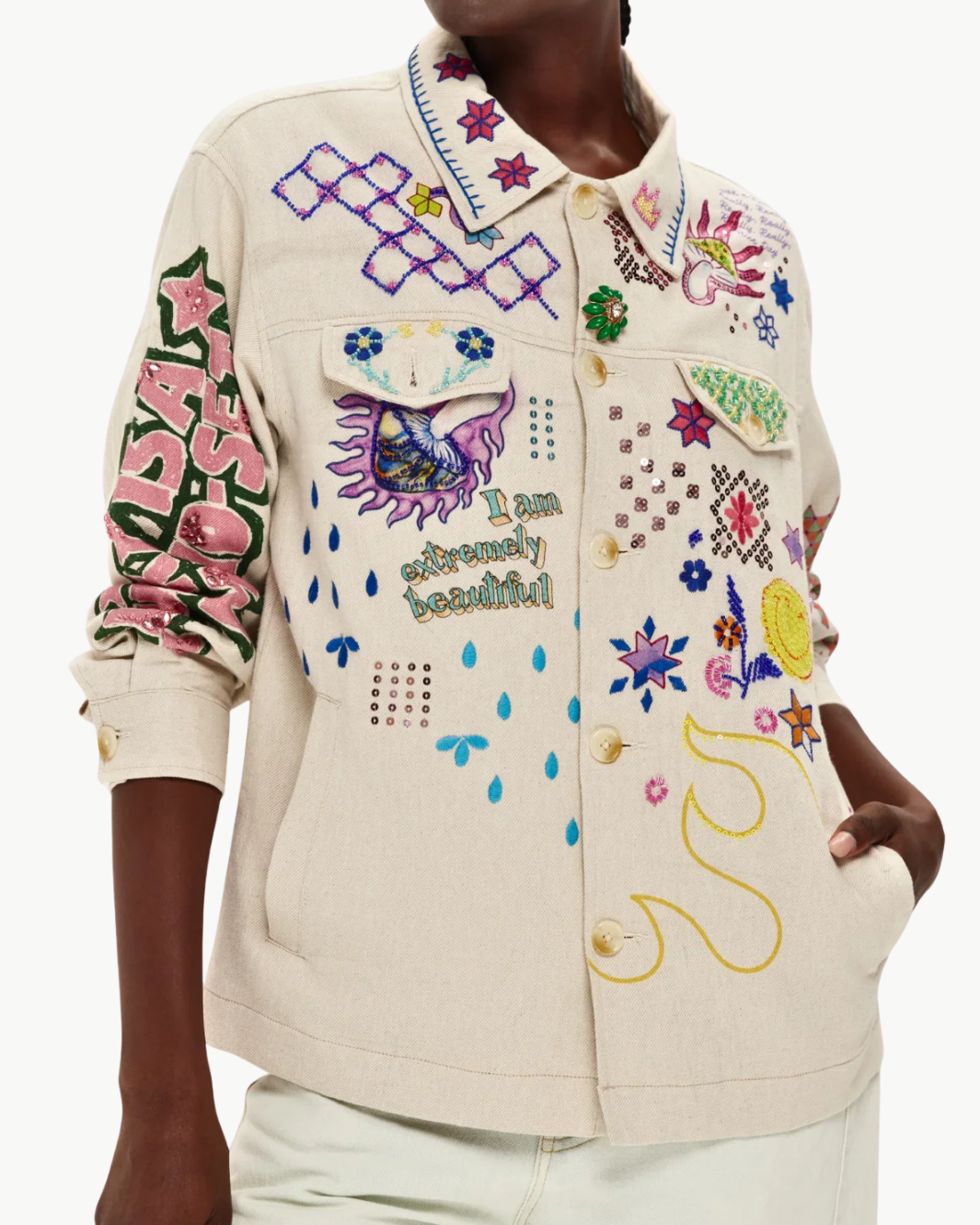 The Briann Embroidered Markers Denim is a wearable work of art designed to celebrate fearless individuality. This hand-painted jacket transforms classic denim into a bold canvas where geometric patterns collide with hand-drawn florals, crying eyes, stars, and empowering affirmations like “I am extremely beautiful.” The back commands attention with a fierce pink tiger and “Find Your Fire” emblazoned across the shoulders. Covered in vibrant, authentic marker artwork created in-studio, every detail radiates color, joy, and unapologetic self-expression. True to size for an easy, confident fit.