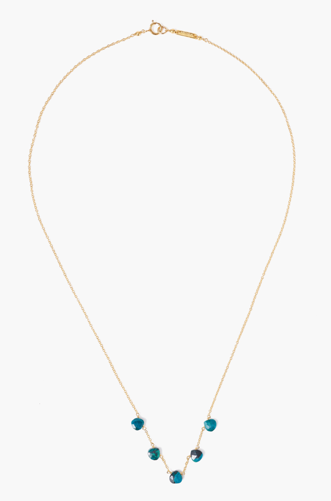 The Dangle Necklace in Chrysocolla by Chan Luu brings a touch of refined color to your jewelry collection. Crafted from 18k gold-plated sterling silver, it features a luminous chrysocolla stone known for its rich blue-green tones and natural variations. Elegant on its own or layered with other gold pieces, this necklace offers effortless sophistication and timeless appeal.