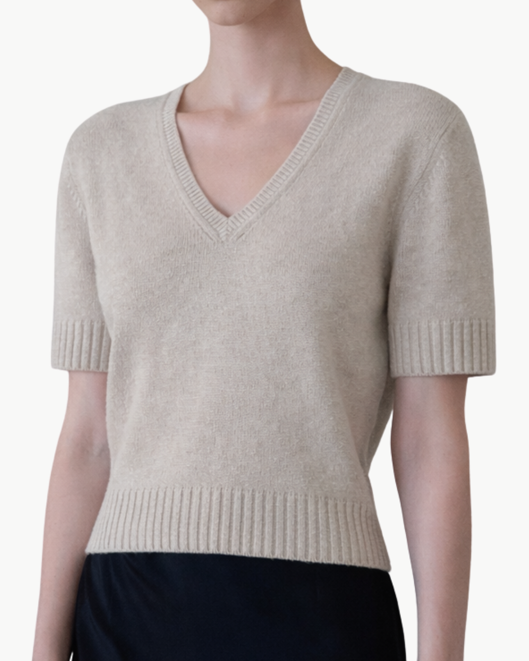 The Eira V Neck Sweater is a timeless cashmere essential, designed with a clean silhouette that feels both polished and effortless. Crafted in pure cashmere, this short sleeve V-neck sweater offers a refined drape and soft hand feel, making it an easy choice for elevated everyday wear.