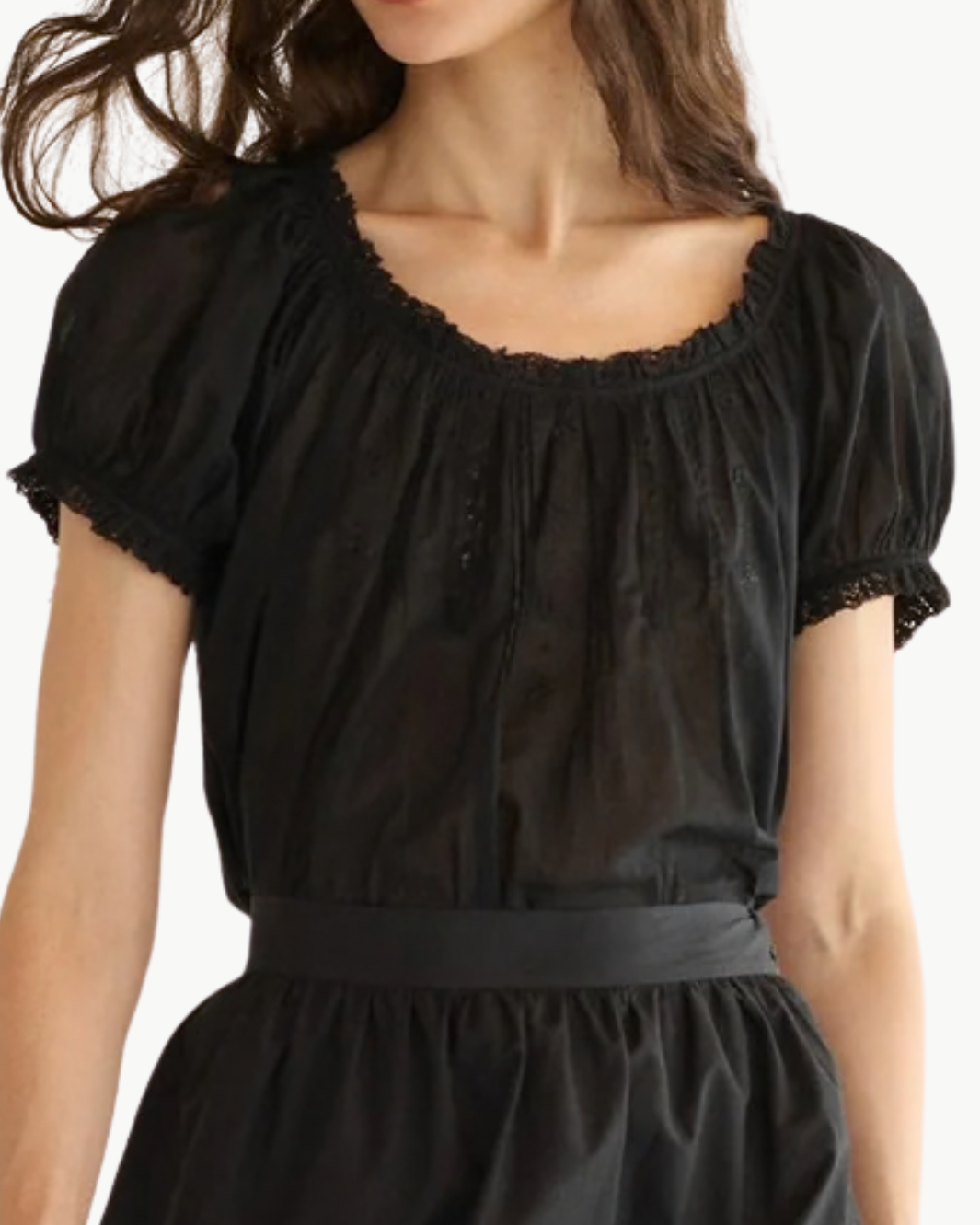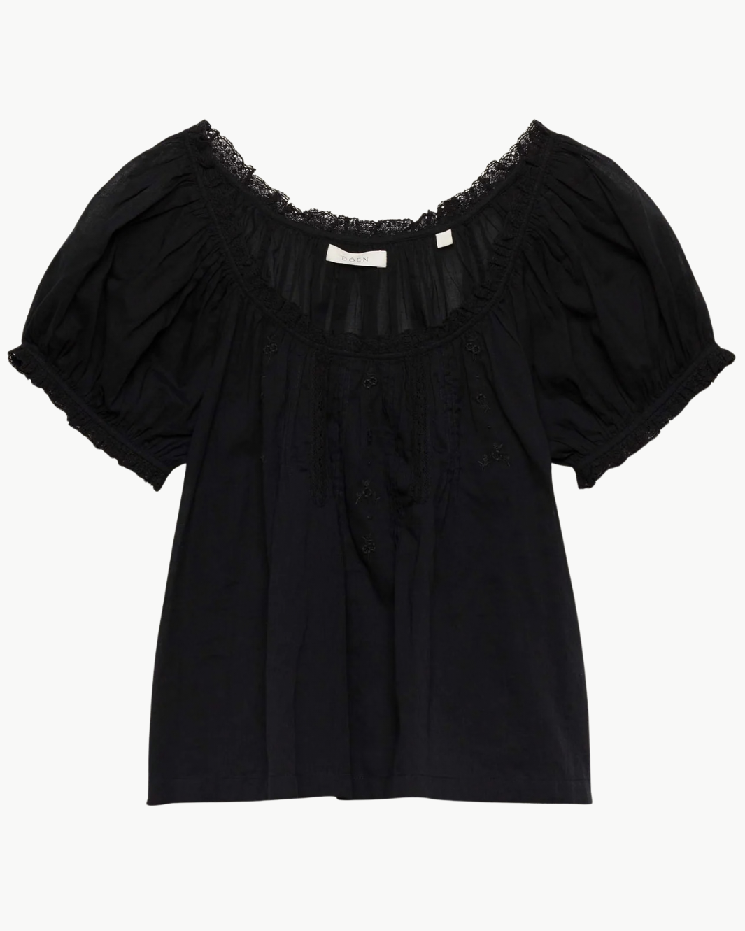 The Frederica Top brings effortless romance to everyday dressing with its airy silhouette and delicate handcrafted details. Rendered in soft organic cotton voile, this breezy blouse features a round neckline and short puffed sleeves finished with scalloped lace. The front is beautifully detailed with alternating pintuck clusters, lace panels, and intricate floral embroidery, creating texture and dimension while maintaining a light, effortless feel.