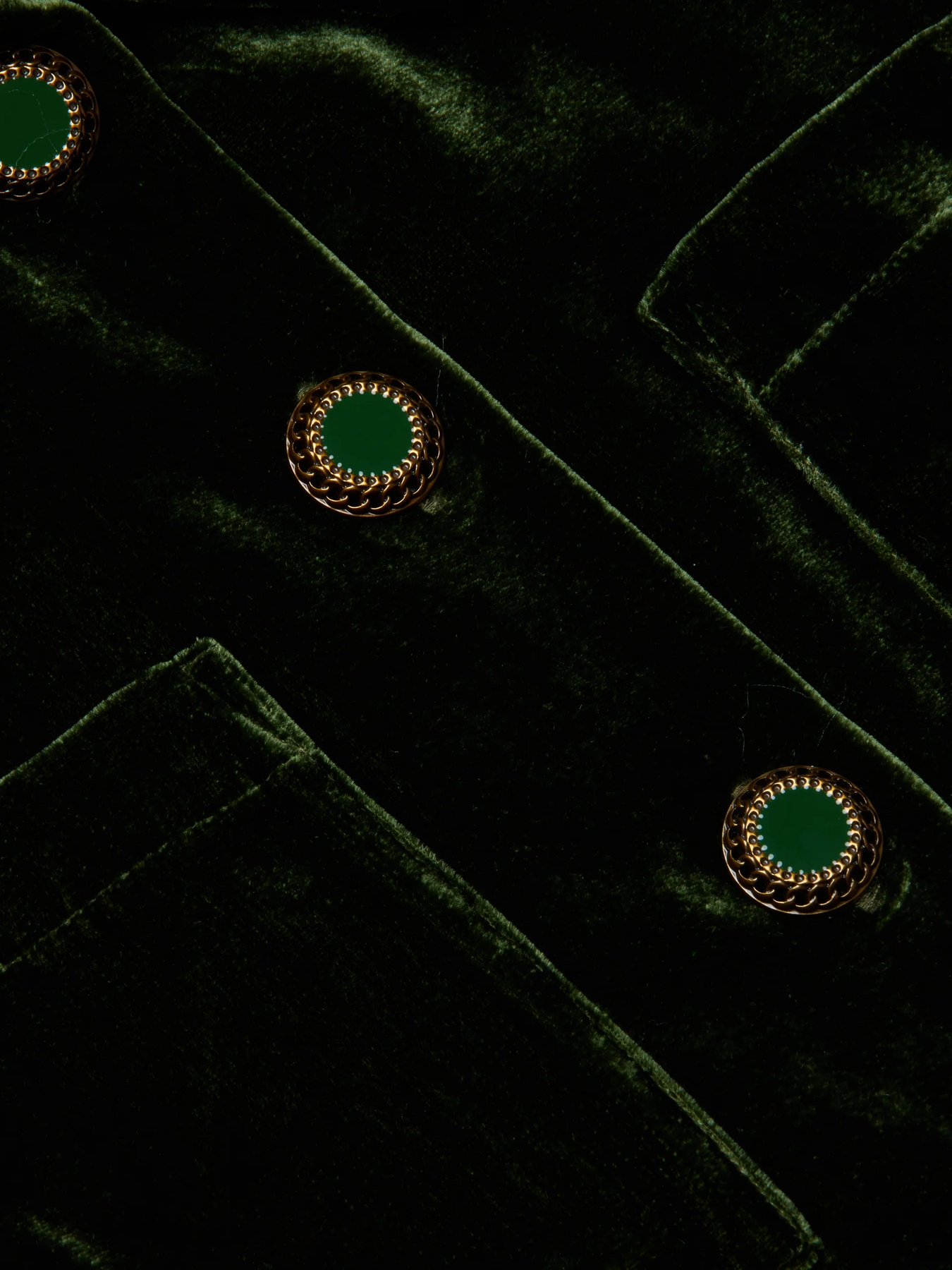 The Jia Velvet Jacket exudes timeless elegance with a modern twist. Crafted from silk-infused velvet in a rich olive hue, this cropped silhouette features structured shoulders, refined three-quarter sleeves, and classic button closures. A plush, elevated layer that transitions seamlessly from day to night.