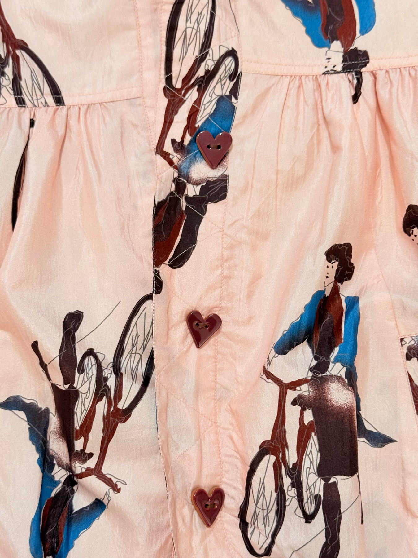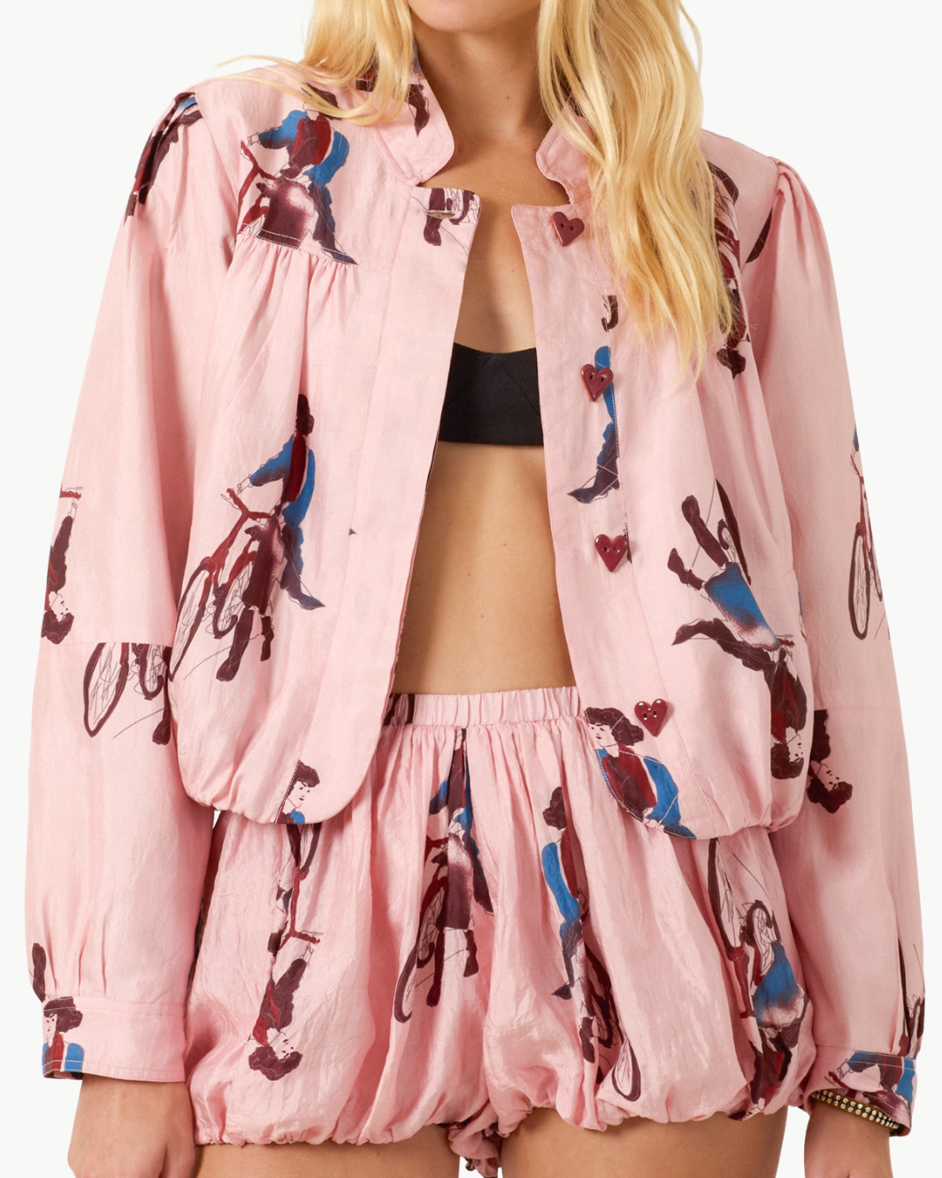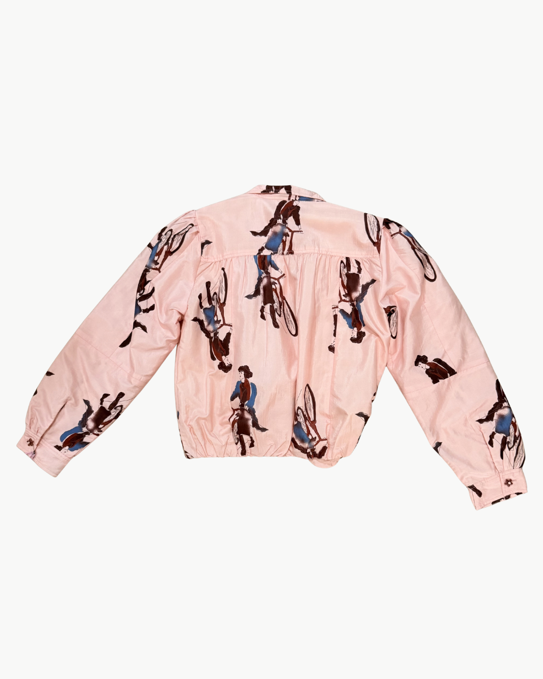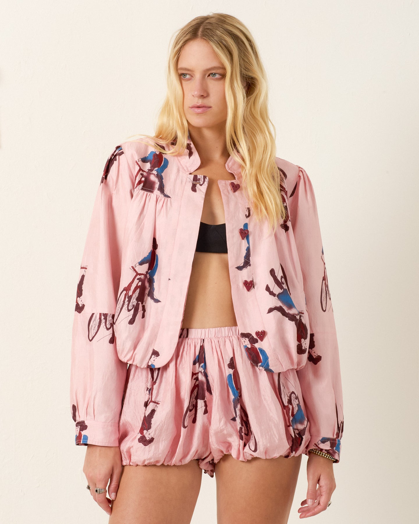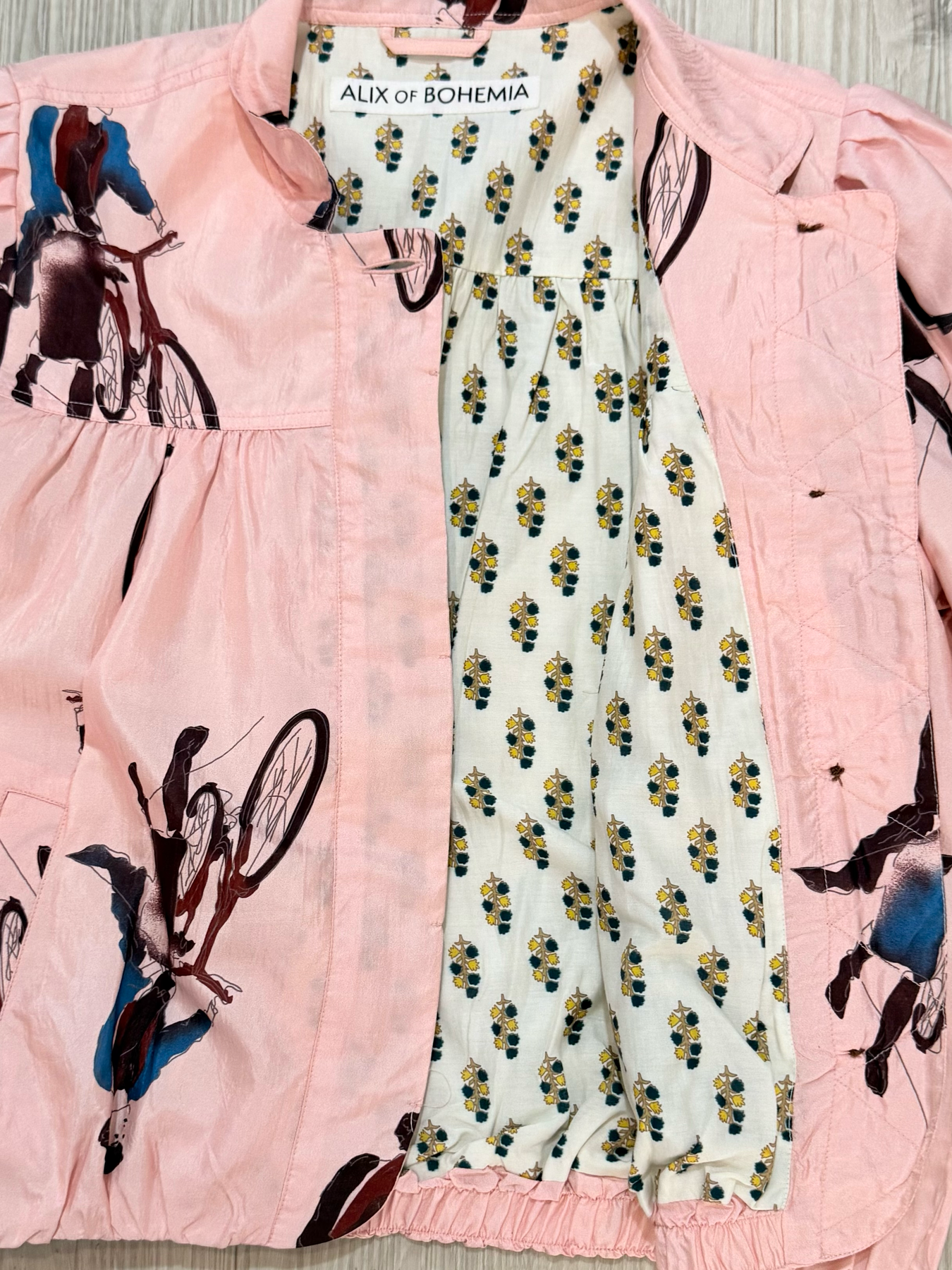 The Jodie Parisian Pedal Jacket captures the whimsical artistry and handcrafted spirit of ALIX OF BOHEMIA. Crafted from luxurious silk, this lightweight jacket features a playful illustrated motif and a softly gathered silhouette that brings effortless charm to everyday layering. Finished with thoughtful tailoring and a cotton-silk lining, each piece reflects subtle variations in weave and dye that highlight the beauty of artisan craftsmanship