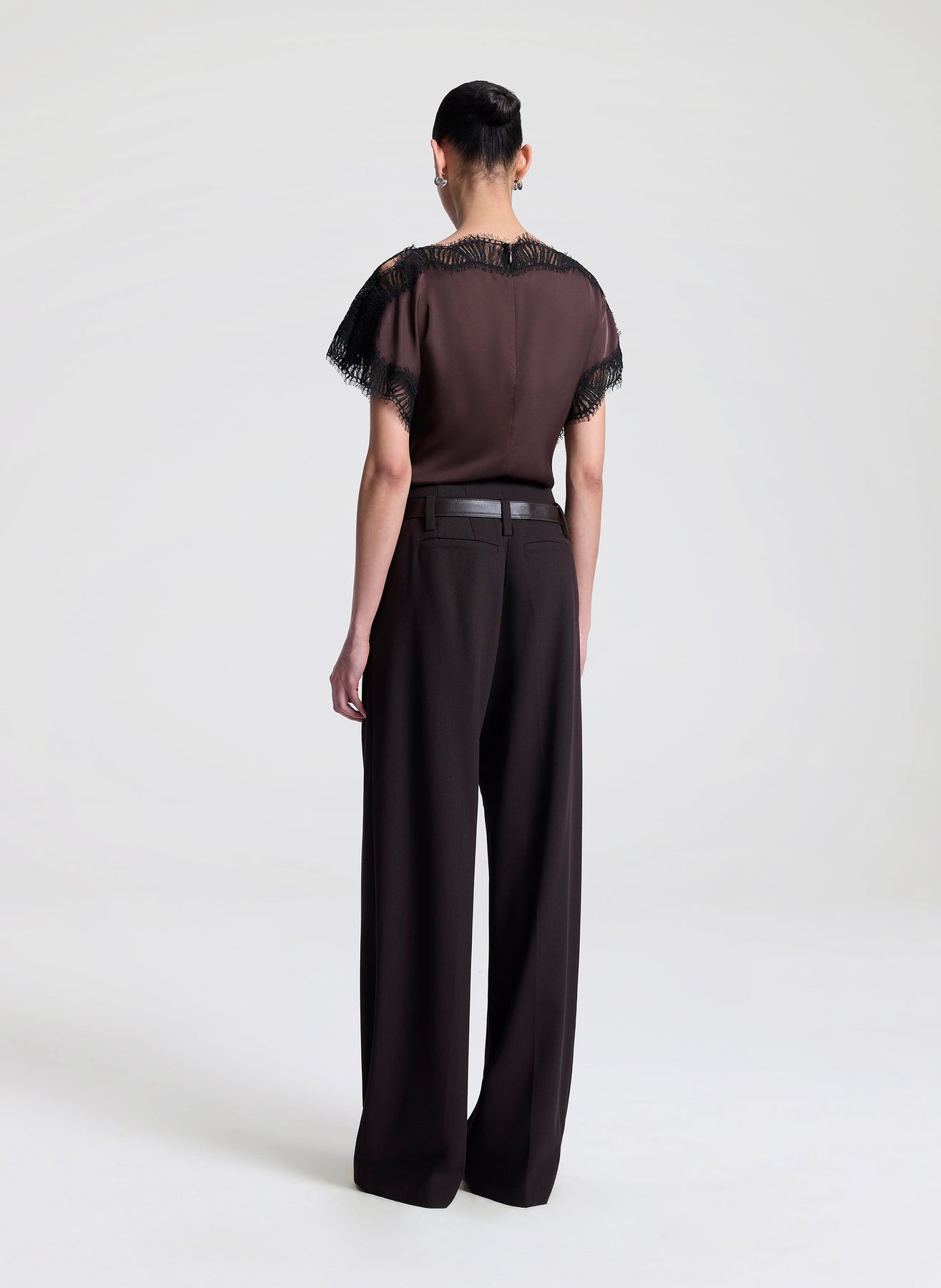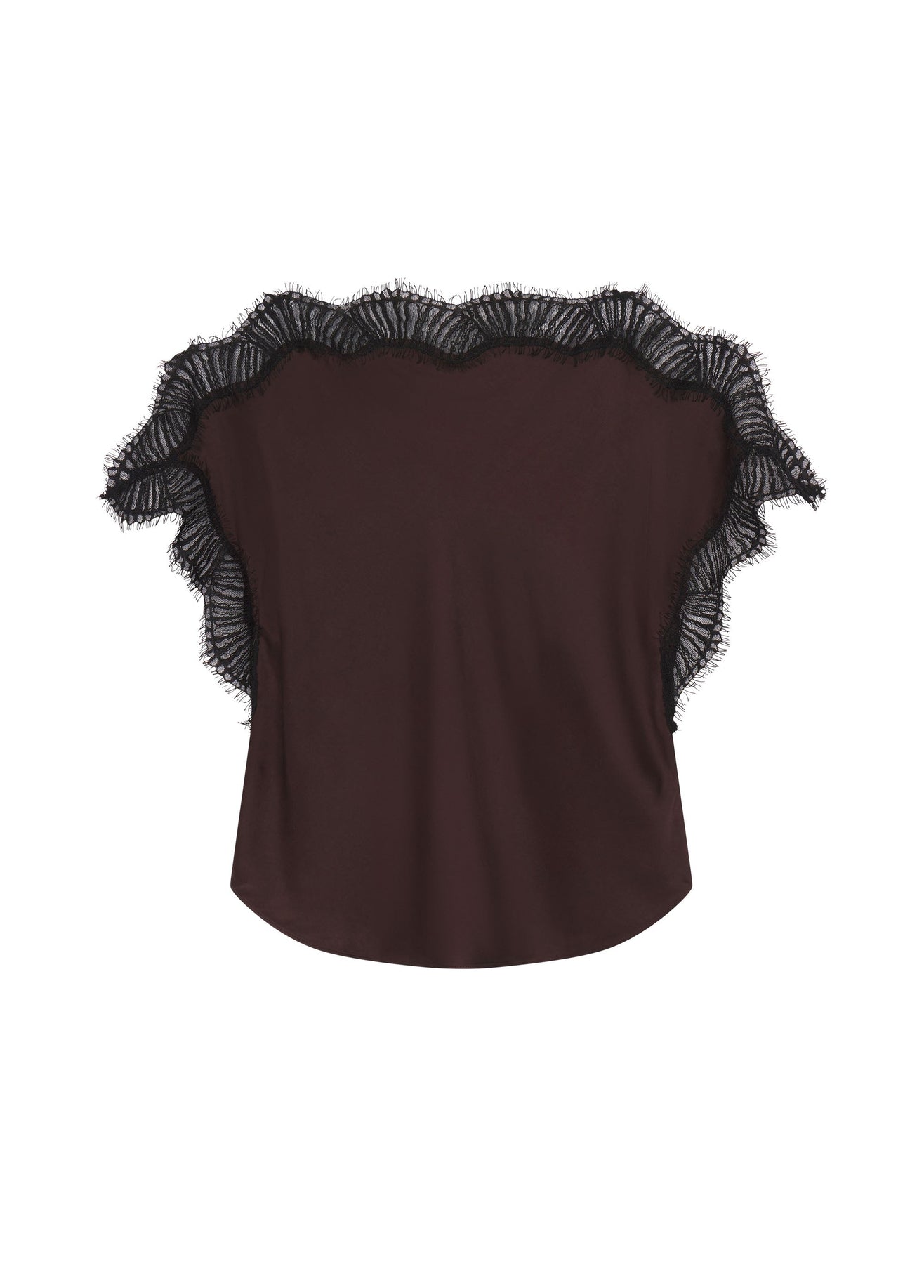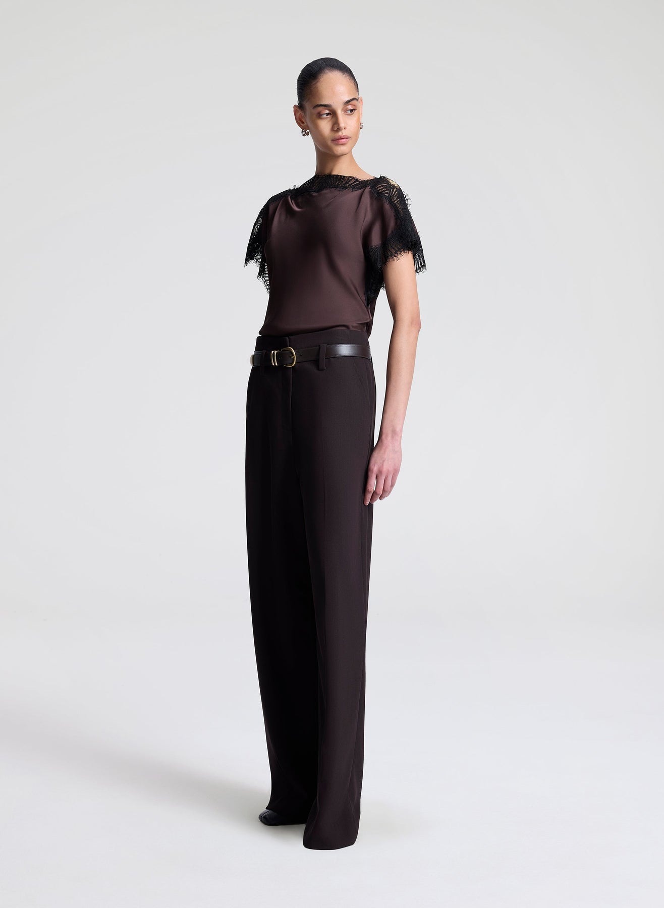 The Luna Satin and Lace Top is crafted from fluid viscose and delicately trimmed with scalloped eyelash lace. A bateau neckline and flutter sleeves bring soft movement and a touch of romance to this elevated piece.