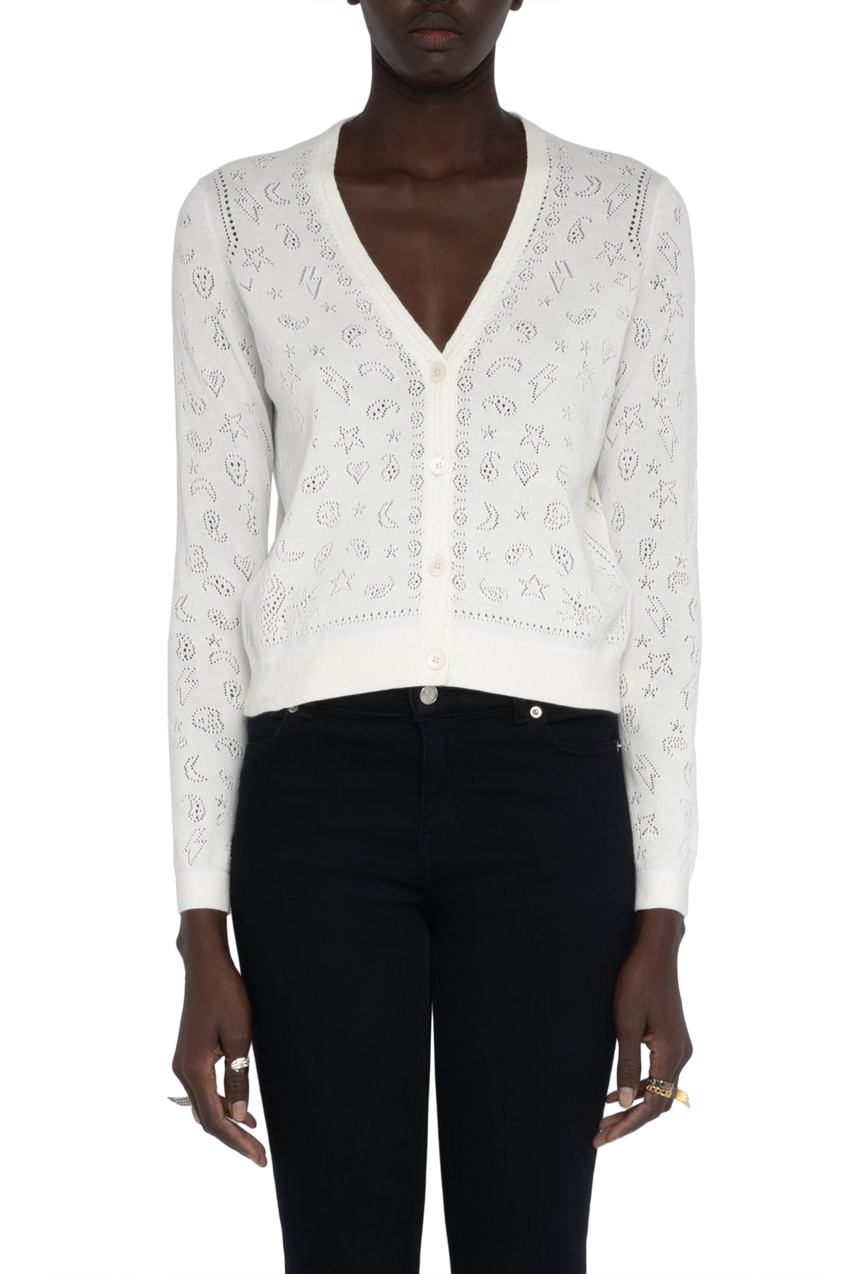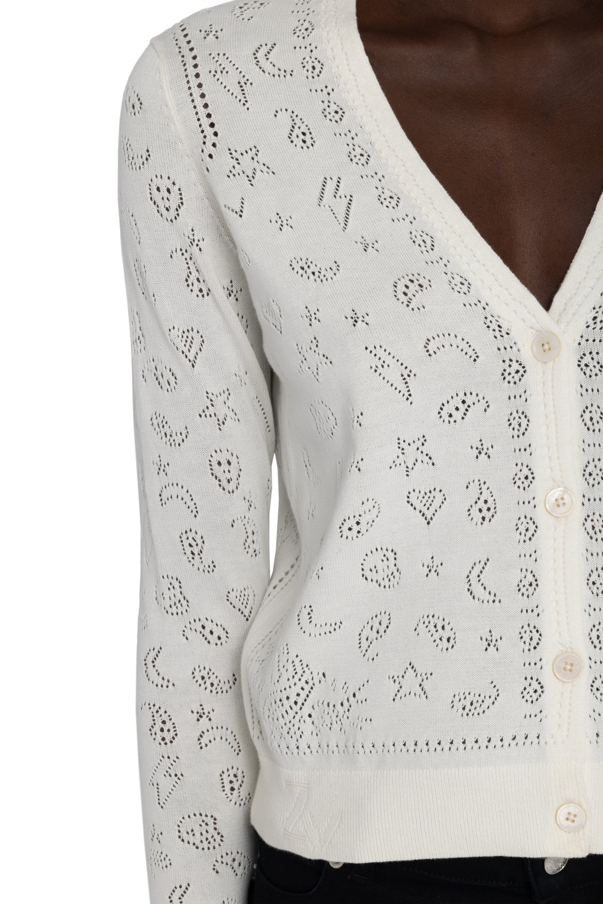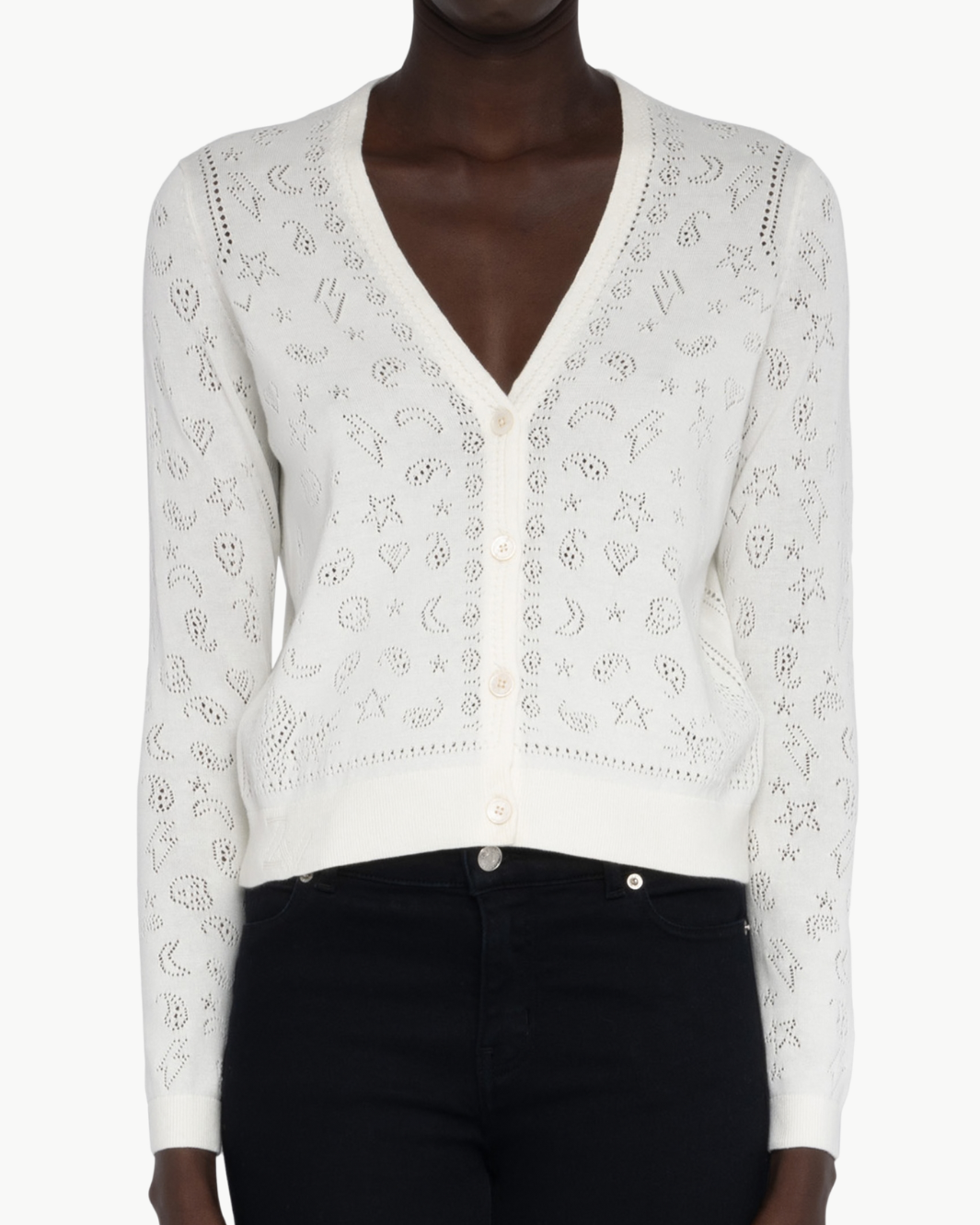 The Manala Bandana Cardigan blends playful motifs with signature edge through intricate pointelle detailing. Crafted from soft cotton, this lightweight knit features hearts, stars, and bandana-inspired paisley patterns alongside wings, lightning bolts, and skulls for a distinctive graphic look. Finished with a classic crew neckline and button-front closure, it’s an effortless layer that adds personality to everyday styling.