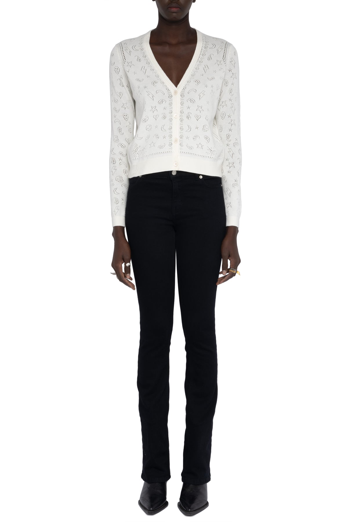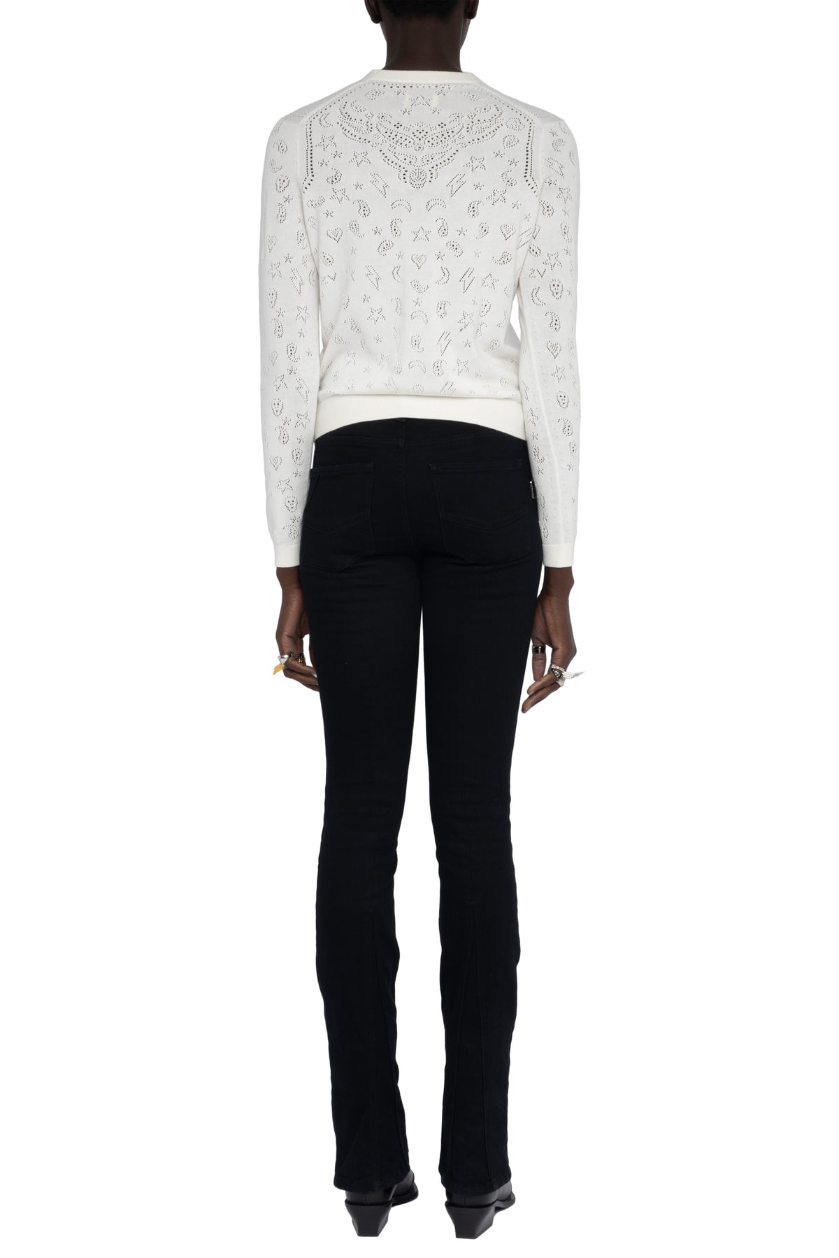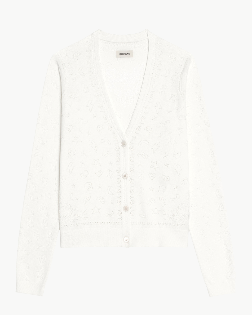 The Manala Bandana Cardigan blends playful motifs with signature edge through intricate pointelle detailing. Crafted from soft cotton, this lightweight knit features hearts, stars, and bandana-inspired paisley patterns alongside wings, lightning bolts, and skulls for a distinctive graphic look. Finished with a classic crew neckline and button-front closure, it’s an effortless layer that adds personality to everyday styling.