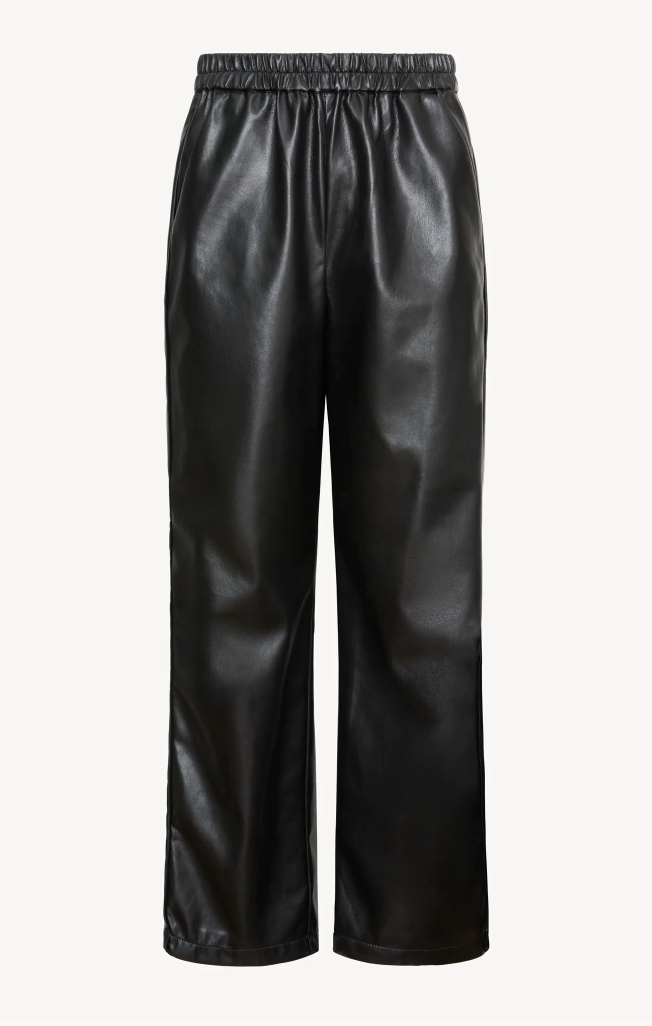 The iconic Max Pant is reimagined in sleek black vegan leather, infusing this timeless silhouette with bold, modern sophistication. Designed with a high waist and a clean, straight-leg cut, it creates a long, streamlined shape while maintaining comfort through a flexible elastic waistband. Both structured and effortless, this polished update transitions seamlessly from day to night—pair it with heels for a refined edge or boots for a cool, contemporary look.