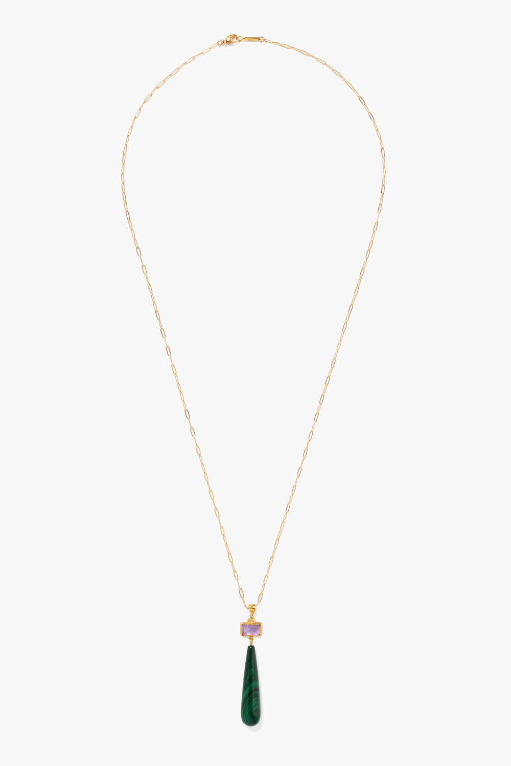 The Messina Necklace Malachite Mix showcases an elegant balance of earthy depth and refined structure. A long green malachite teardrop anchors the piece, crowned with a bezel-wrapped agate that adds rich contrast. Suspended from a long gold chain, the pendant’s sleek silhouette highlights its natural beauty while creating a striking, graceful statement.