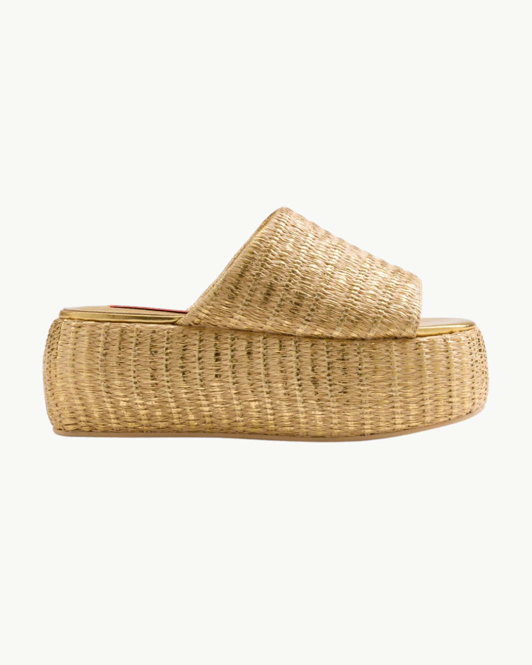 This platform slide sandal is designed with a bold, sculptural profile and effortless slip-on ease. A cushioned vegan leather footbed offers everyday comfort, while the textured raffia upper with a subtle metallic finish adds dimension and modern appeal. Elevated yet wearable, it’s the kind of sandal that instantly upgrades warm-weather looks.