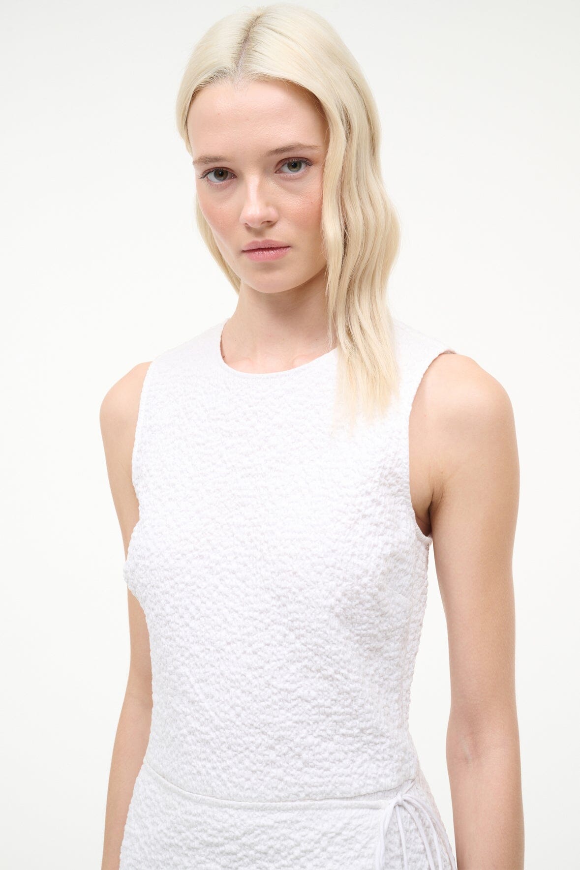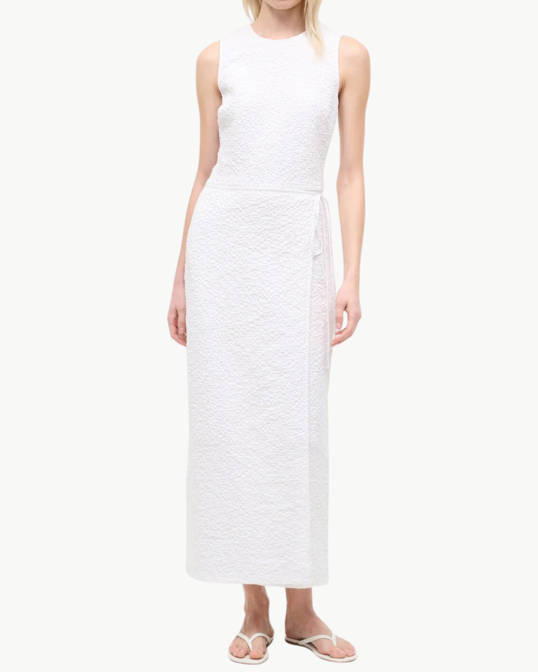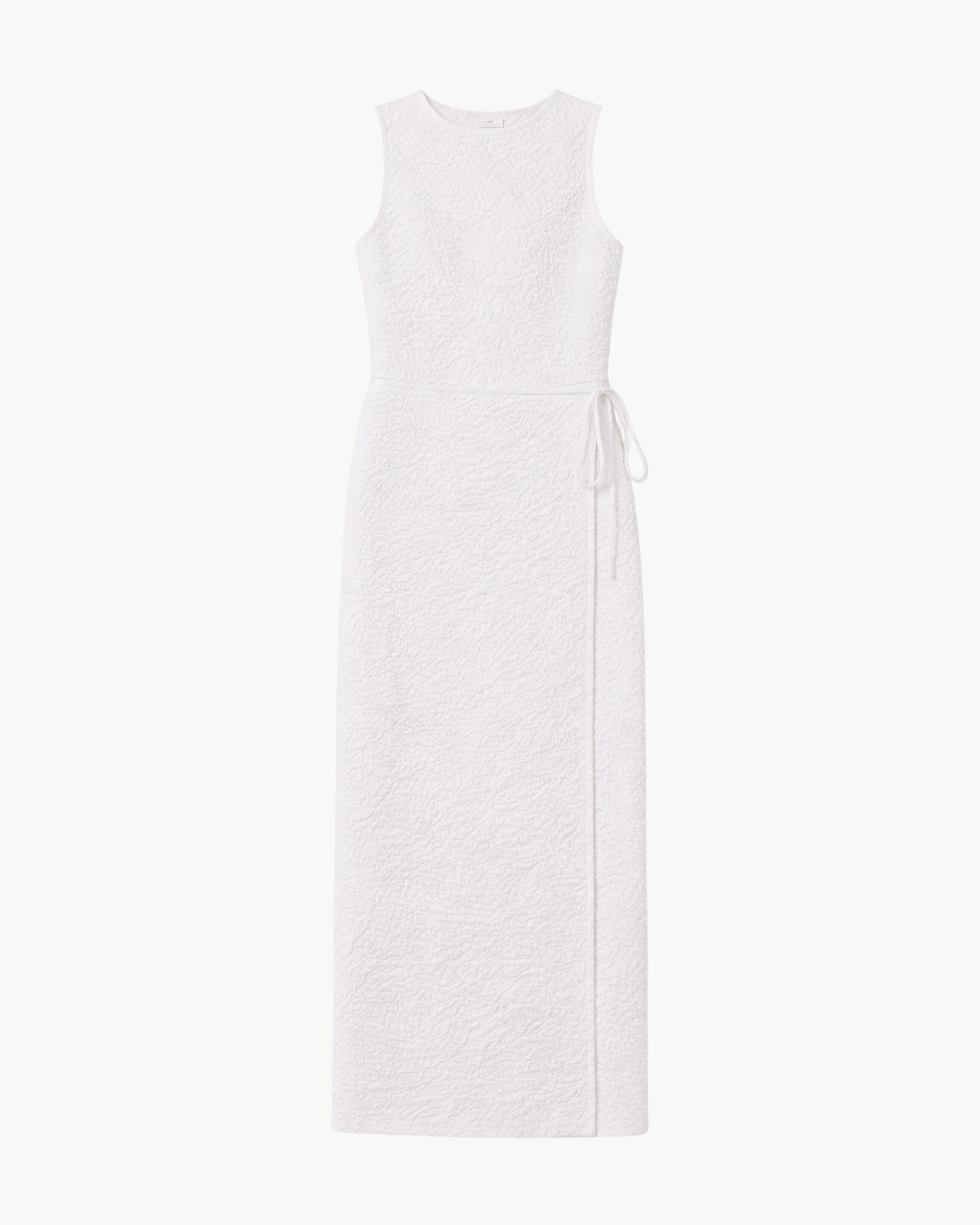 The Nema Dress is a refined cotton silhouette defined by soft smocking and an easy wrap skirt that moves beautifully with the body. Designed with a center back zip closure and adjustable waist ties, this white dress balances structure and ease for a flattering, feminine fit.