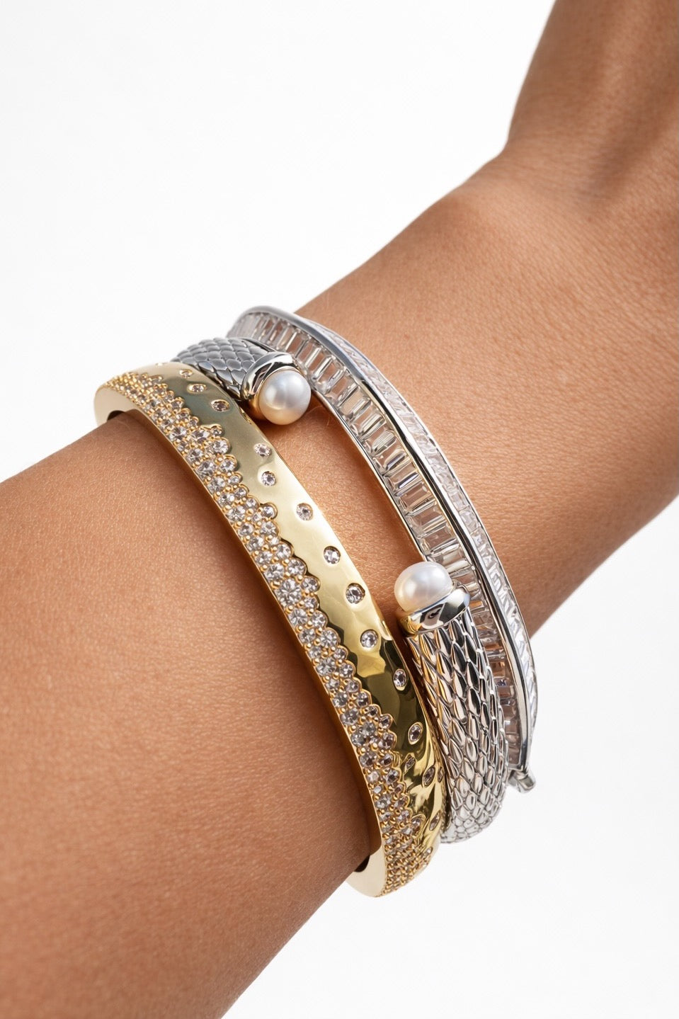 Sleek and sculptural, this polished bangle is accented with geometric baguette stones that catch the light from every angle. The clean, modern silhouette creates a refined statement, while the secure trigger clasp offers both style and practicality. Elegant worn alone or layered with other bracelets, it brings a subtle sparkle to everyday styling.