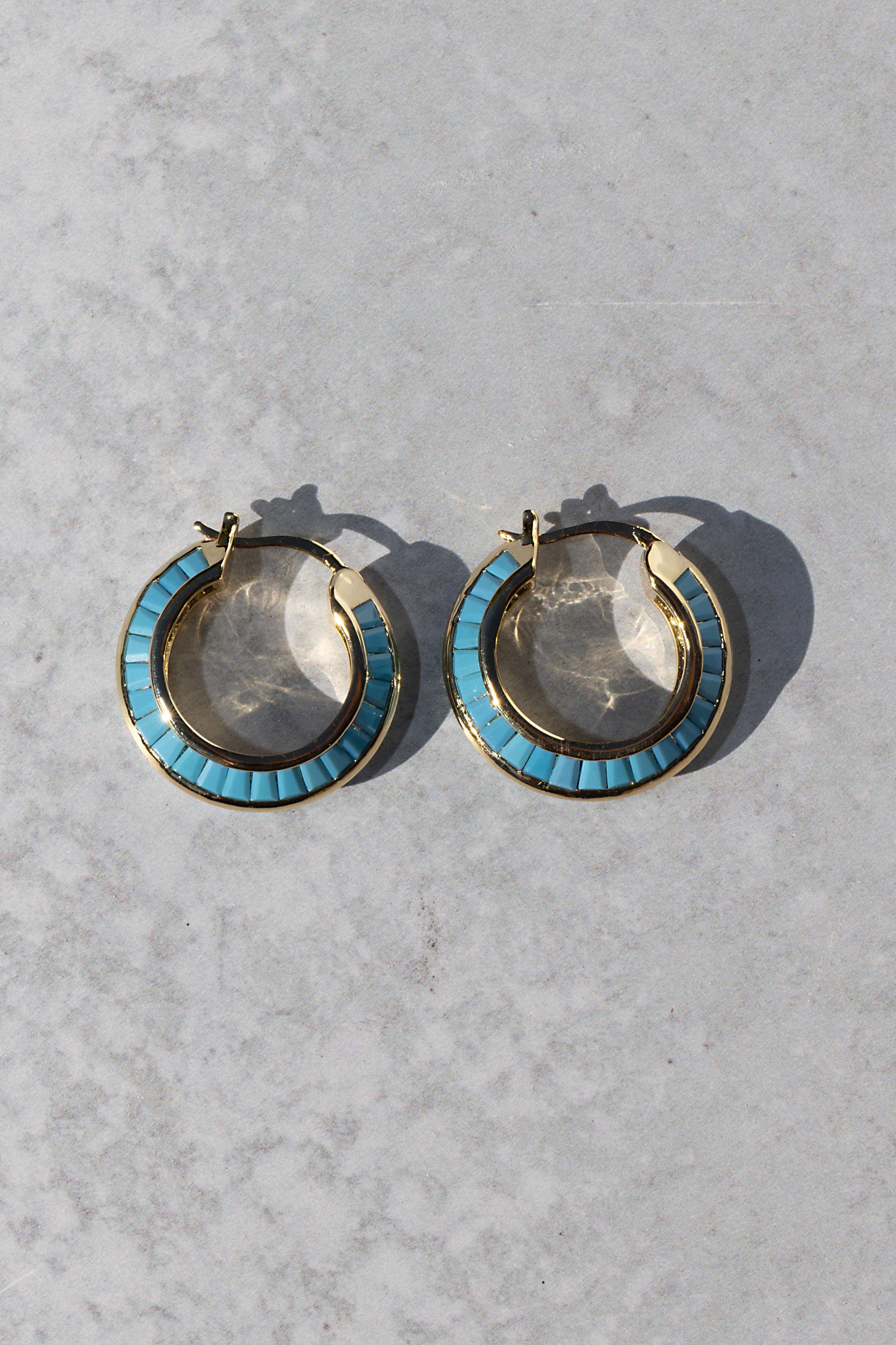 Sleek and sculptural with a modern edge, these gold-plated hoops strike the perfect balance between everyday polish and statement shine. A row of geometric CZ baguette stones is accented by a vibrant turquoise detail, creating a refined yet eye-catching finish that transitions effortlessly from day to evening.