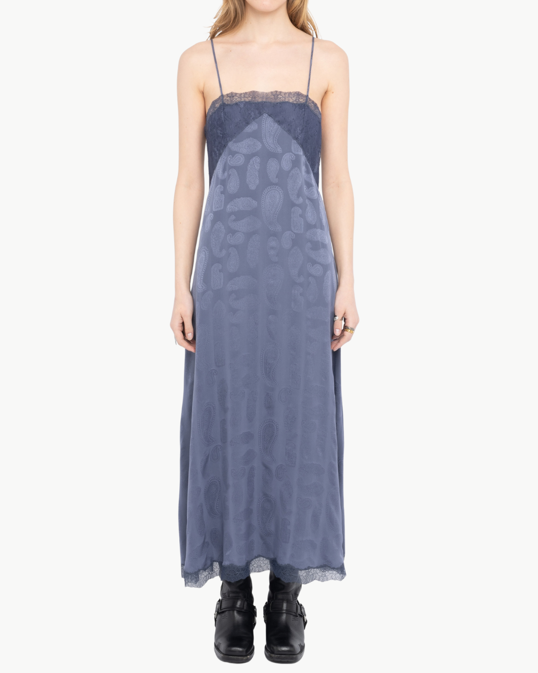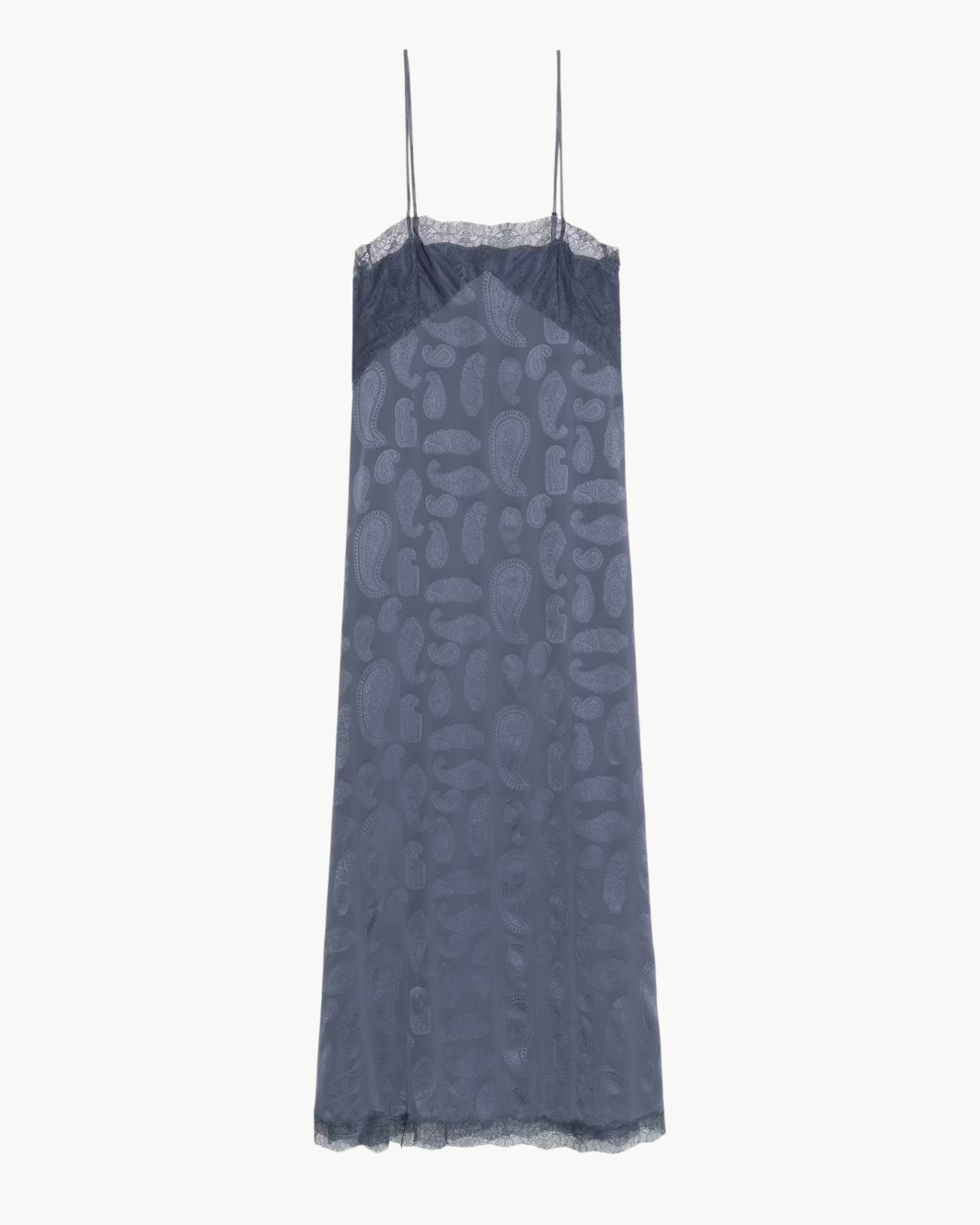This lingerie-inspired mid-length dress brings effortless elegance with a fluid, feminine silhouette. Crafted from silk jacquard, it features delicate lace detailing at the bust and hem that adds soft texture and romantic refinement. Adjustable straps allow for a customizable fit, making it an easy piece to style from day to evening.