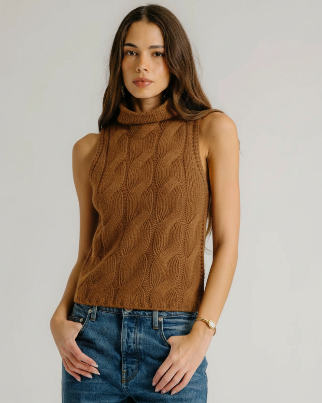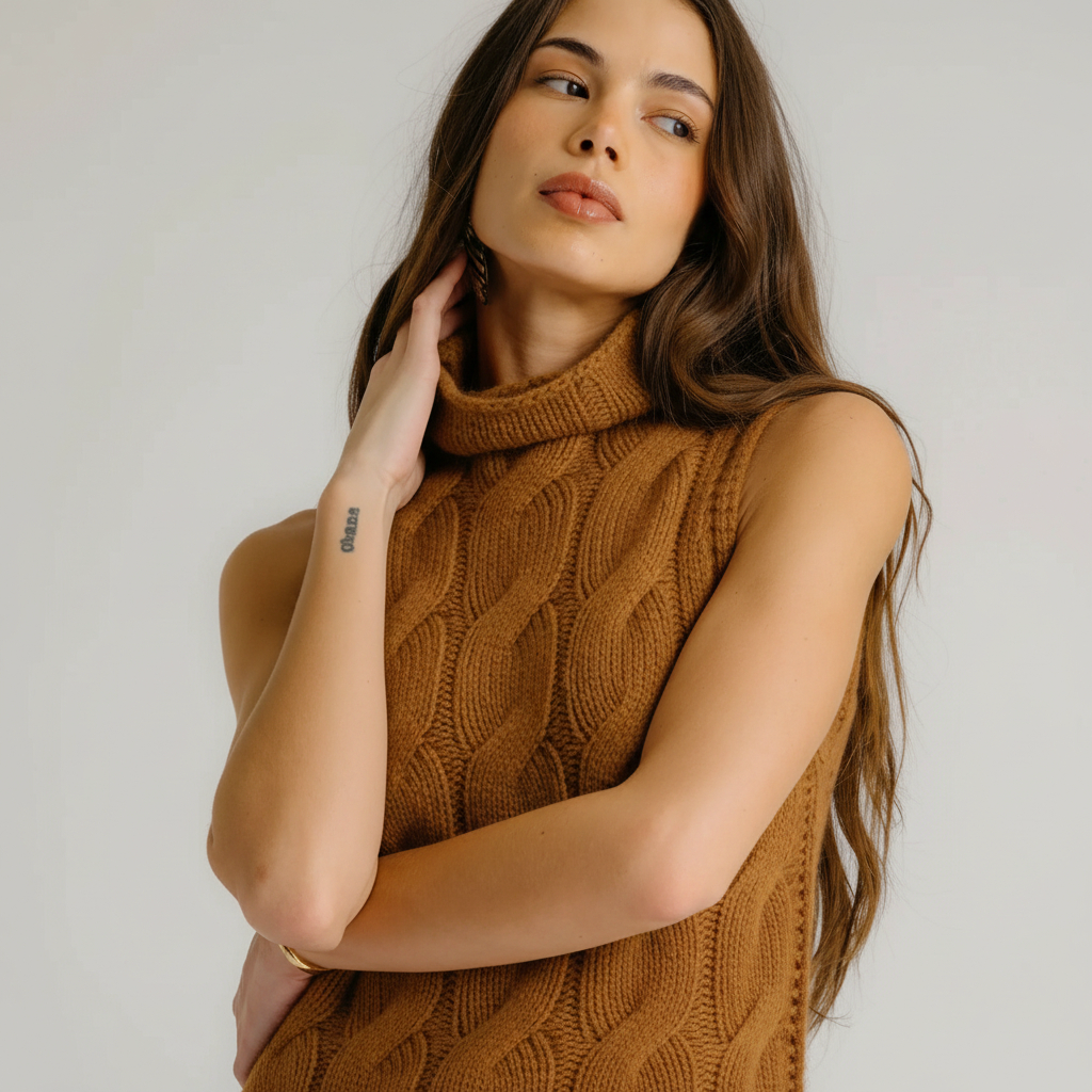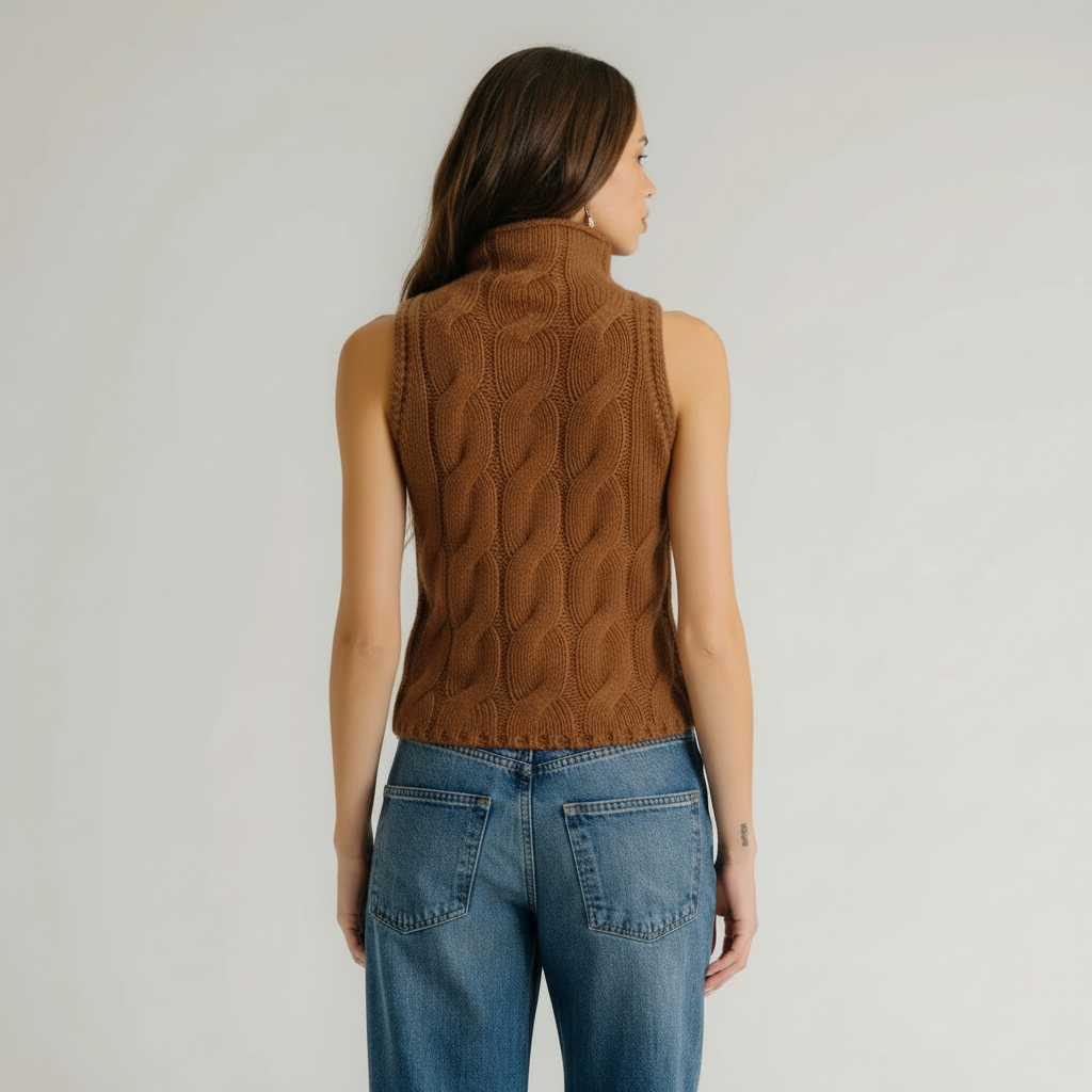 Refined and effortlessly luxurious, the Salvia Sleeveless Cashmere Cable Turtleneck is crafted from soft 100% cashmere for exceptional warmth and comfort. The classic cable knit texture adds depth and timeless appeal, while the sleeveless silhouette offers modern versatility, perfect for layering or wearing on its own. Finished with a cozy turtleneck, this piece brings elevated polish to cool-weather styling.