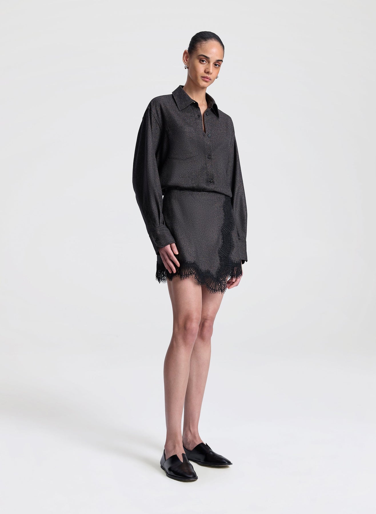 The Sophia Wool Marled and Lace Mini Skirt from A.L.C. is a wrap mini skirt crafted from softly structured woven stretch mouliné tailoring, finished with delicate eyelash lace for a refined touch.