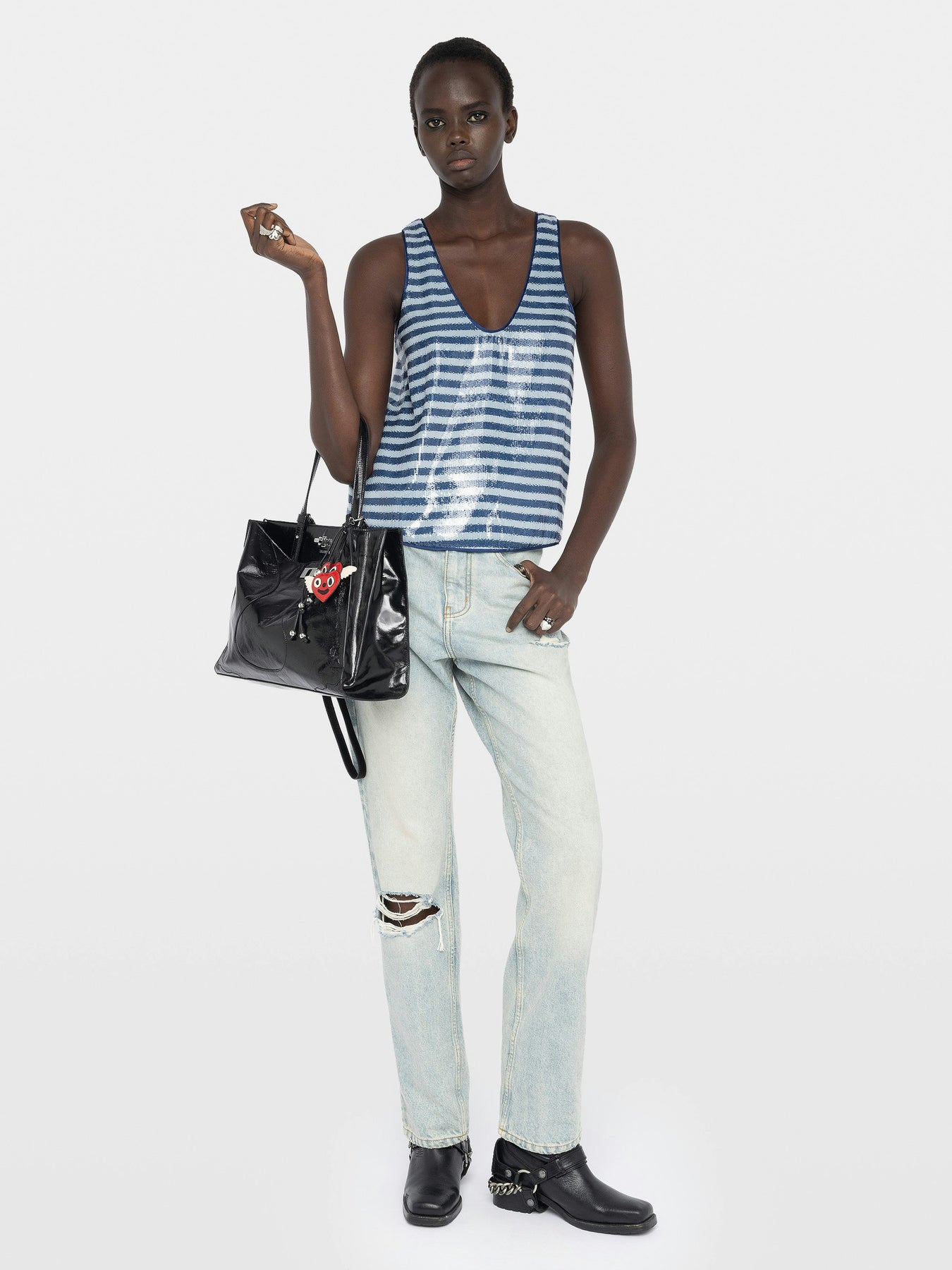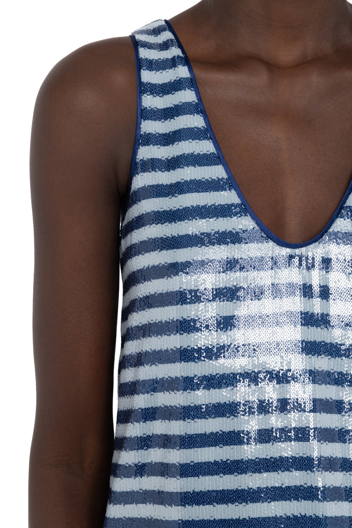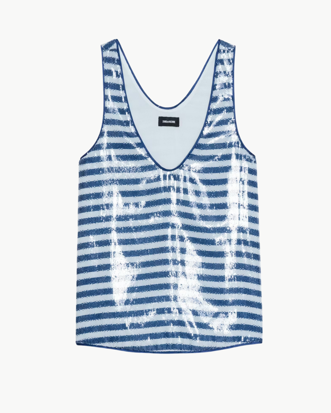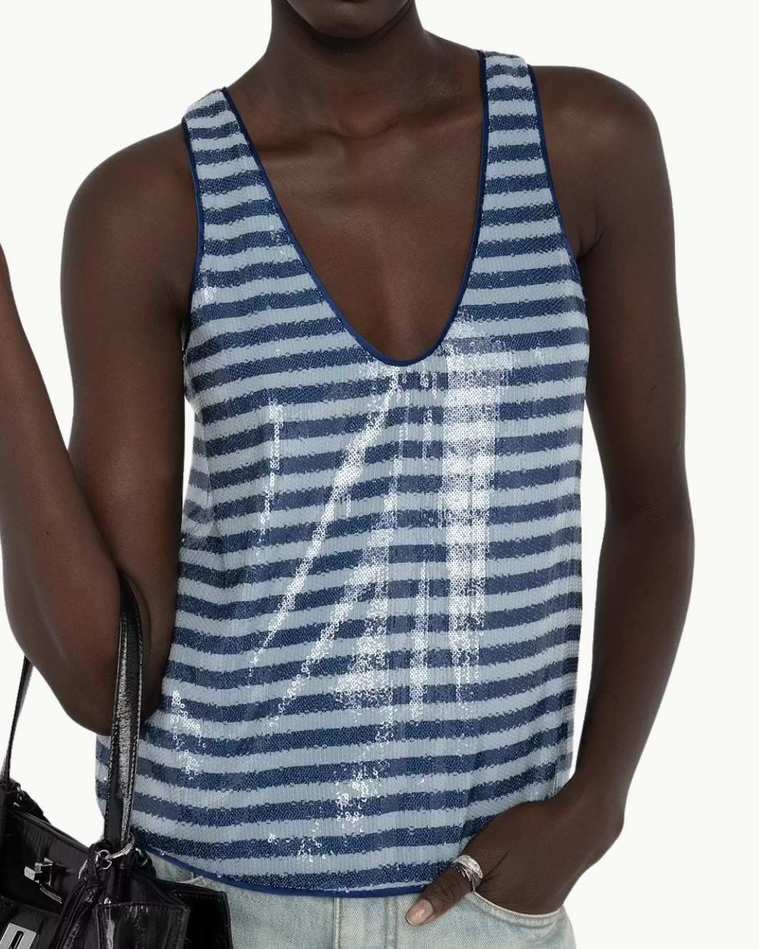 This tank top blends classic nautical inspiration with a touch of shimmer. Designed with a sailor-stripe pattern and subtle sequin embellishments, it offers a relaxed silhouette with a flattering U neckline. The lightweight design makes it an effortless piece for warm-weather styling or layering.