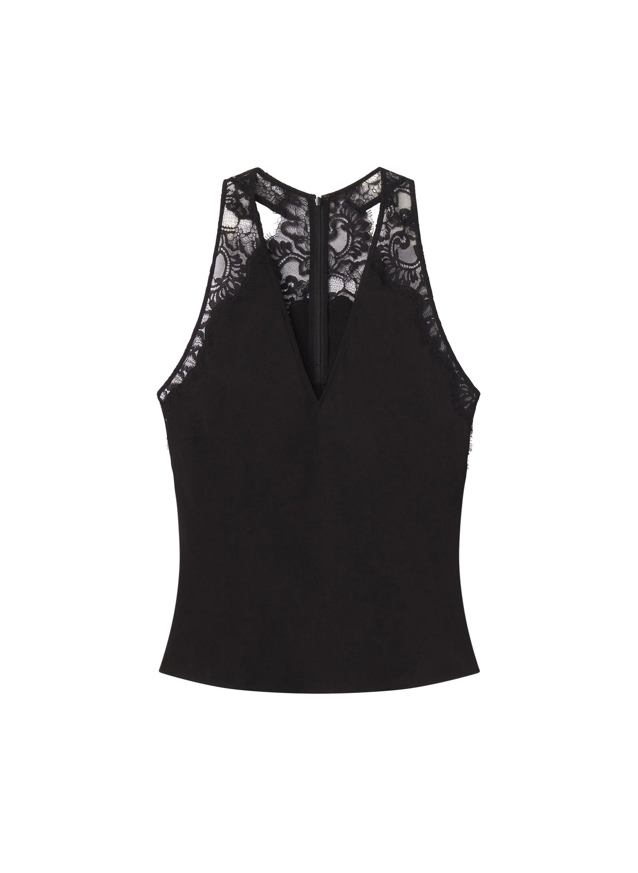 The Wes Top from A.L.C. is an elevated essential that captures modern sophistication. Crafted from luxurious crepe-back satin, this sleeveless V-neck blouse features French heritage lace panels at the shoulders that extend into a dramatic lace back, adding delicate texture and allure. Designed to drape beautifully, it offers a polished, fluid silhouette perfect for both layered and standalone styling.